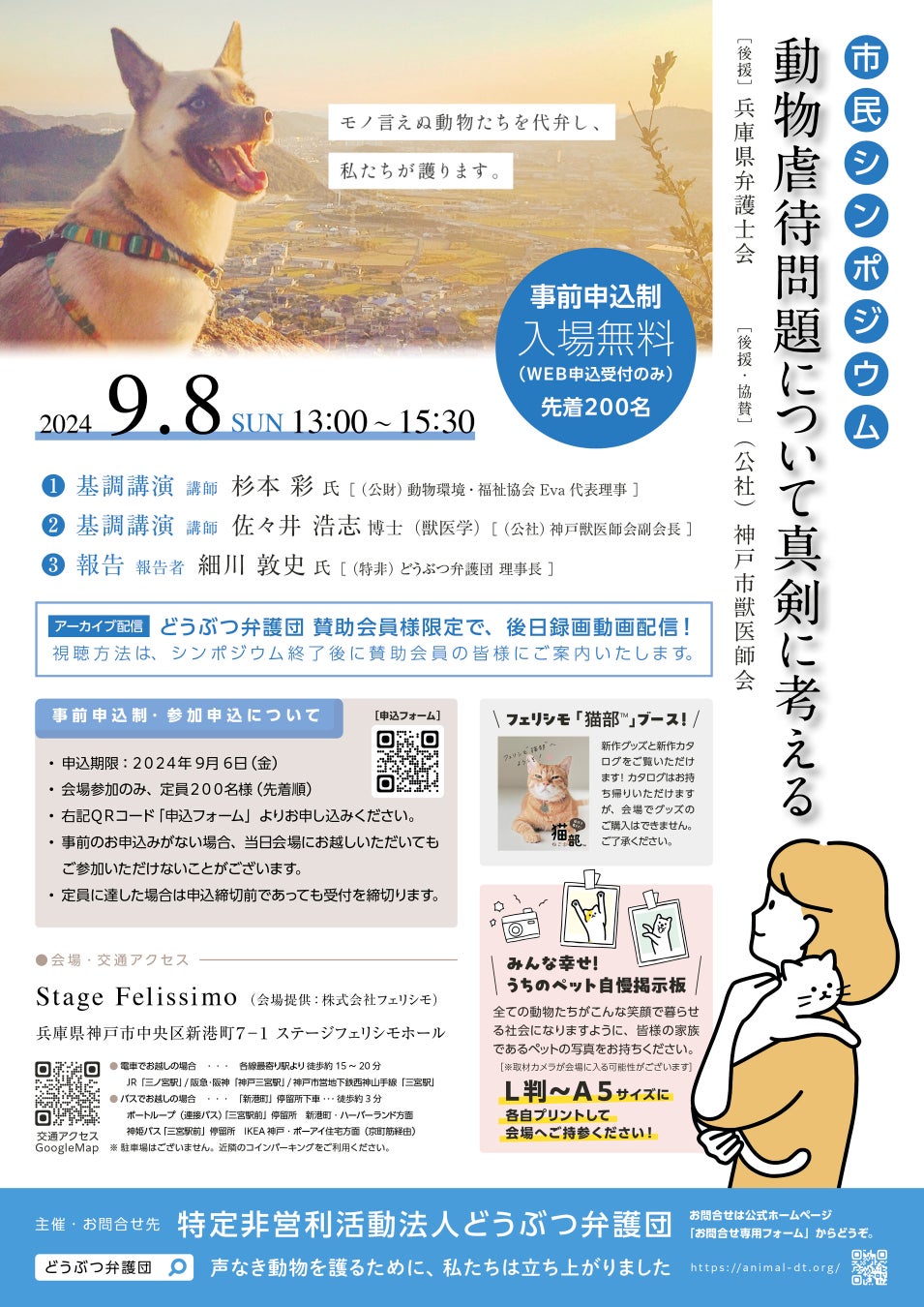 動物虐待問題について真剣に考える - NPO法人どうぶつ弁護団主催、2024年9月8日(日)に開催、参加費無料(先着200名事前申込制)
