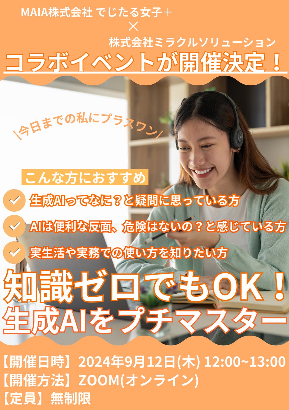 女性のリスキリングに強みを持ち、教育と就労支援を目的としたコミュニティ「でじたる女子+(でじたるじょしぷらす)」を運営するMAIA株式会社とMicrosoftテクノロジーに強みを持つクラウドインテグレーターの株式会社ミラクルソリューションが共同セミナーを2024年9月12日(木)オンラインにて開催いたします!