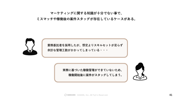 実際に、企業側に十分なマーケティング知見・経験が無いために、適切なマーケティング課題が整理されておらず必要な人材課題が定義できていない、業務委託人材の正確なスキルの把握ができていない、業務委託人材を活用できる社内体制が作れていないなど、結果としてミスマッチに繋がってしまっている、という声をよく伺います。