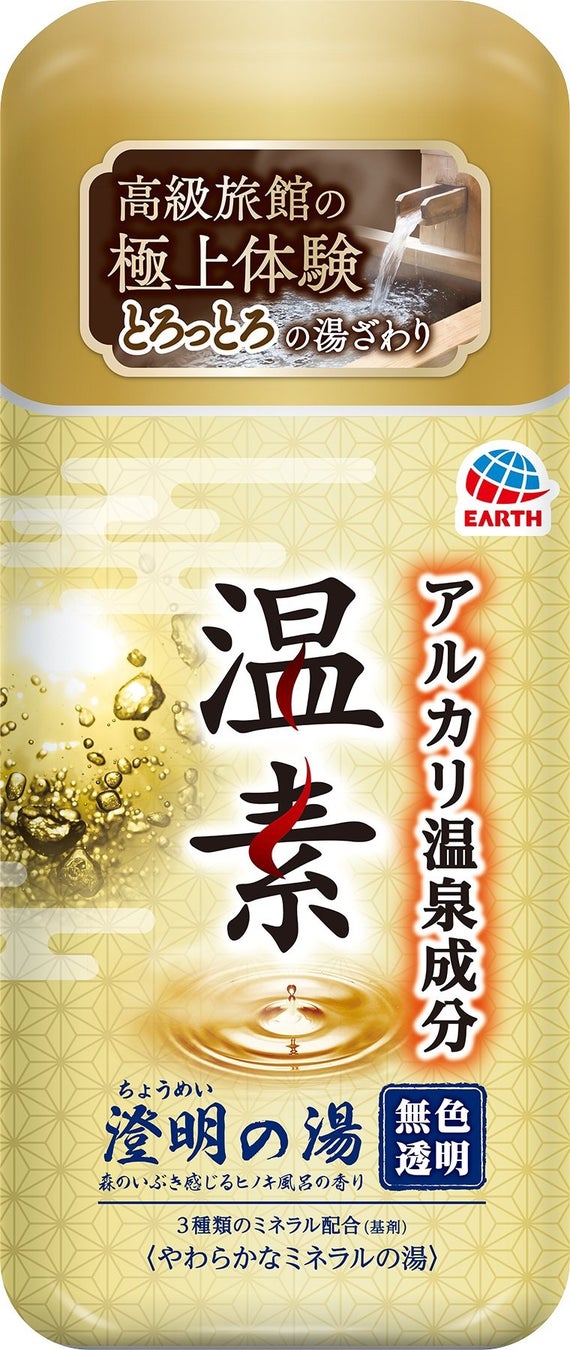 本格志向の方へ アルカリ温泉成分配合の入浴剤。澄み渡るやわらかな【ミネラル泉】の極上の湯ざわりを追求。森のいぶき感じるヒノキ風呂の香り、無色透明のお湯です。