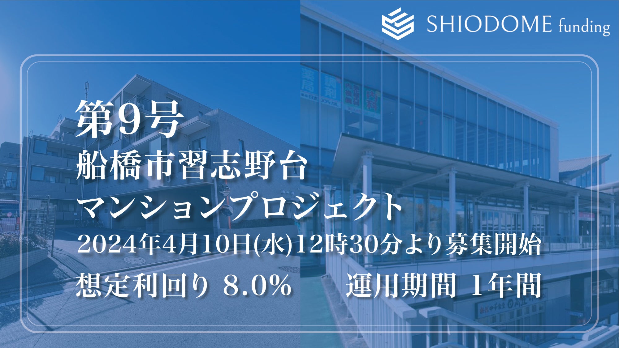 汐留プロパティ株式会社(代表取締役社長:大原龍/本社:東京都港区東新橋一丁目5番2号 汐留シティセンター33階、以下、「当社」。)はネットで完結する不動産投資クラウドファンディング「汐留funding」において、第9号プロジェクトとなる「船橋市習志野台マンションプロジェクト」(以下、「本プロジェクト」。)の情報を公開しましたのでお知らせします。