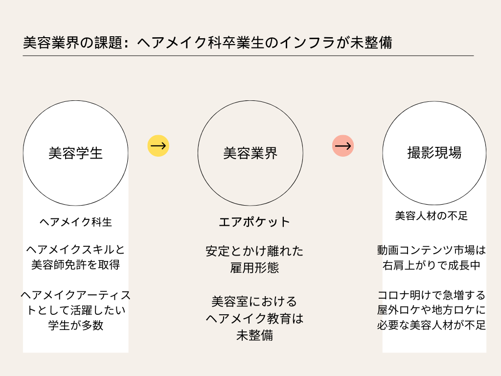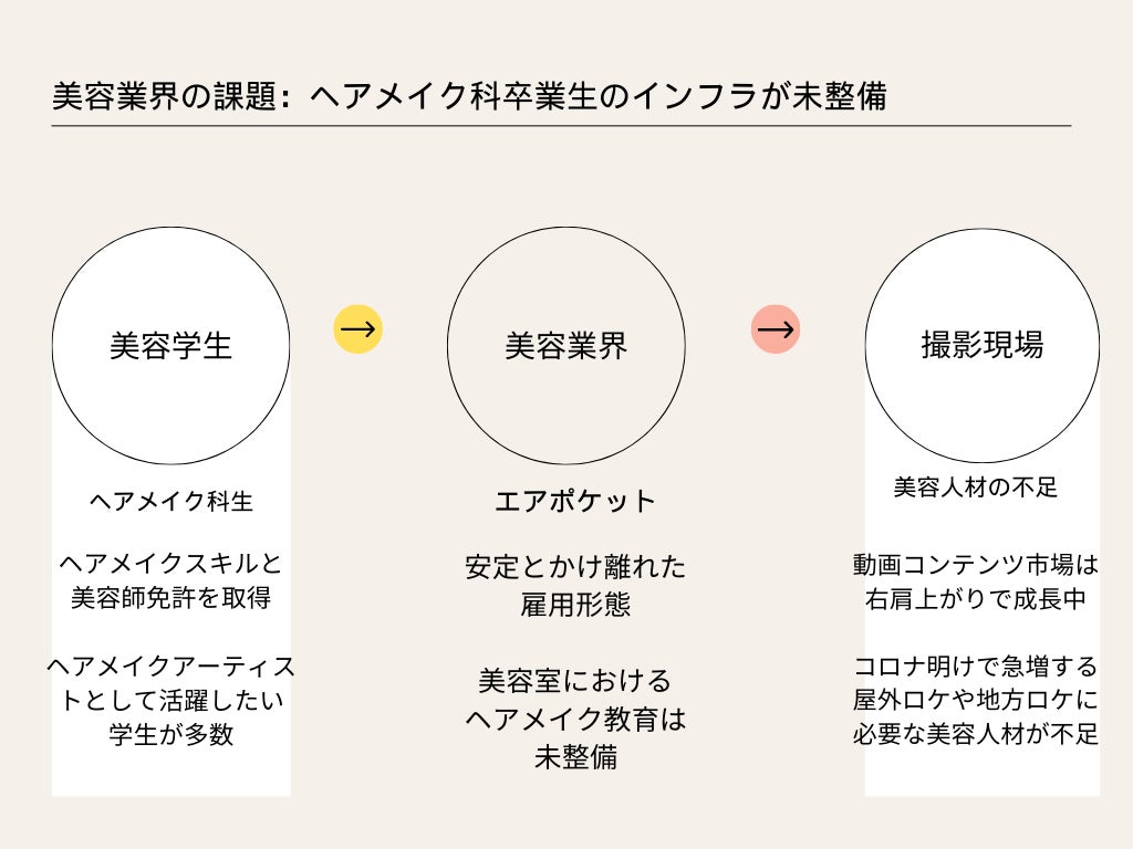 ヘアメイクアーティストとして活躍したい美容人材の成り手は多くあり、また、動画マーケットの拡大により撮影現場で美容人材の需要が高まっているにもかかわらず、キャリアパスとなる企業の受け入れ体制が整っていないために、せっかく美容学校がインフラを整備し育てた人材が、市場に届く前にこぼれ落ちている現状です。
