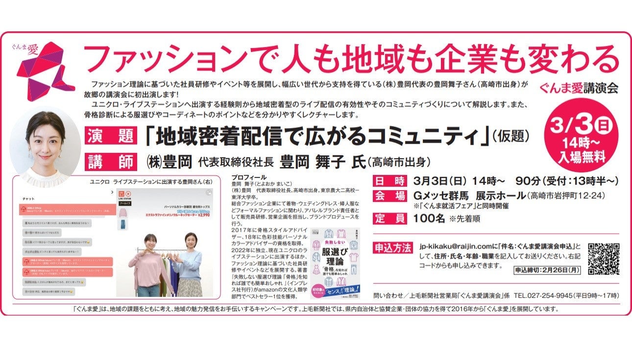 【地方創生】3/3(日)上毛新聞社主催『ぐんま愛講演会』にて株式会社豊岡 (代表取締役社長豊岡舞子)が登壇「ファッションで人も地域も企業も変わる」