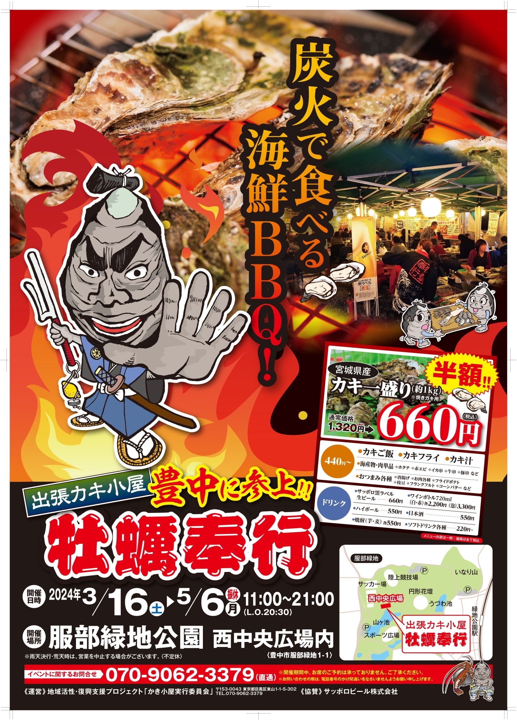 服部緑地公園で牡蠣!3/16〜 出張カキ小屋が服部緑地公園にやってきます「地域活性・復興支援プロジェクト 牡蠣奉行」休日にご家族と!お仕事帰りの皆様も!