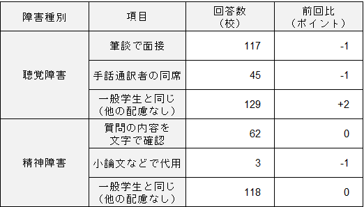 精神障害のある学生への面接試験での合理的配慮として、「質問内容を文字で確認」「質問を理解しやすいよう工夫」「個別面接の実施」「筆談で面接」などが一定数の大学で行われています。