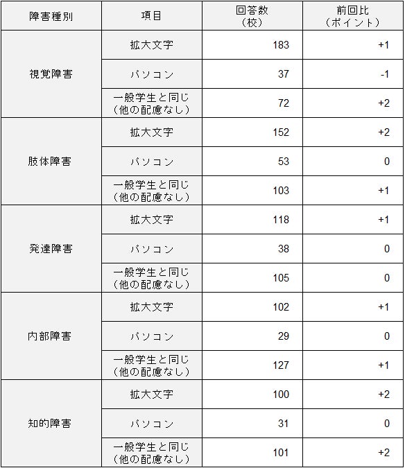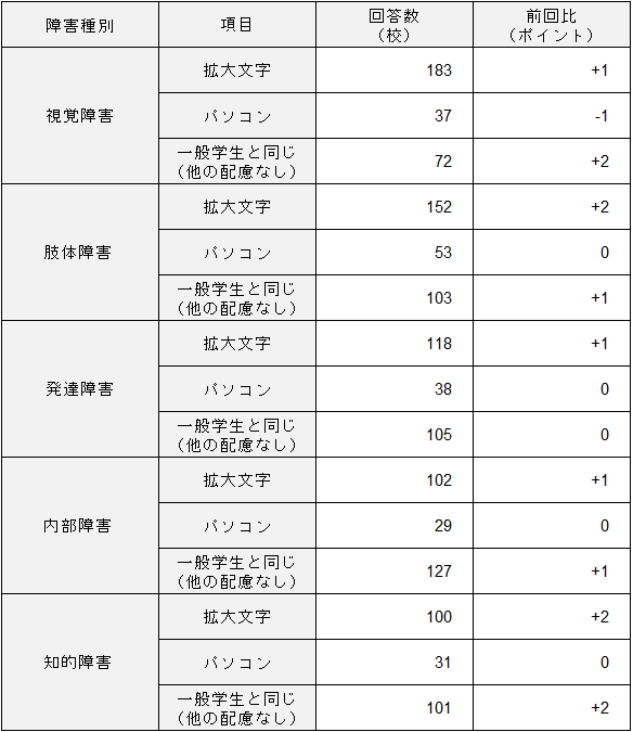多くの障害で「拡大文字」が解答方法の主流となっていますが、それ以外の方法は実施校が少なく、前回比でも大きな変化はありません。「一般学生と同じ」のみを選択し他の配慮を行わない大学が依然として多く、受験機会を制限する要因となっています。
