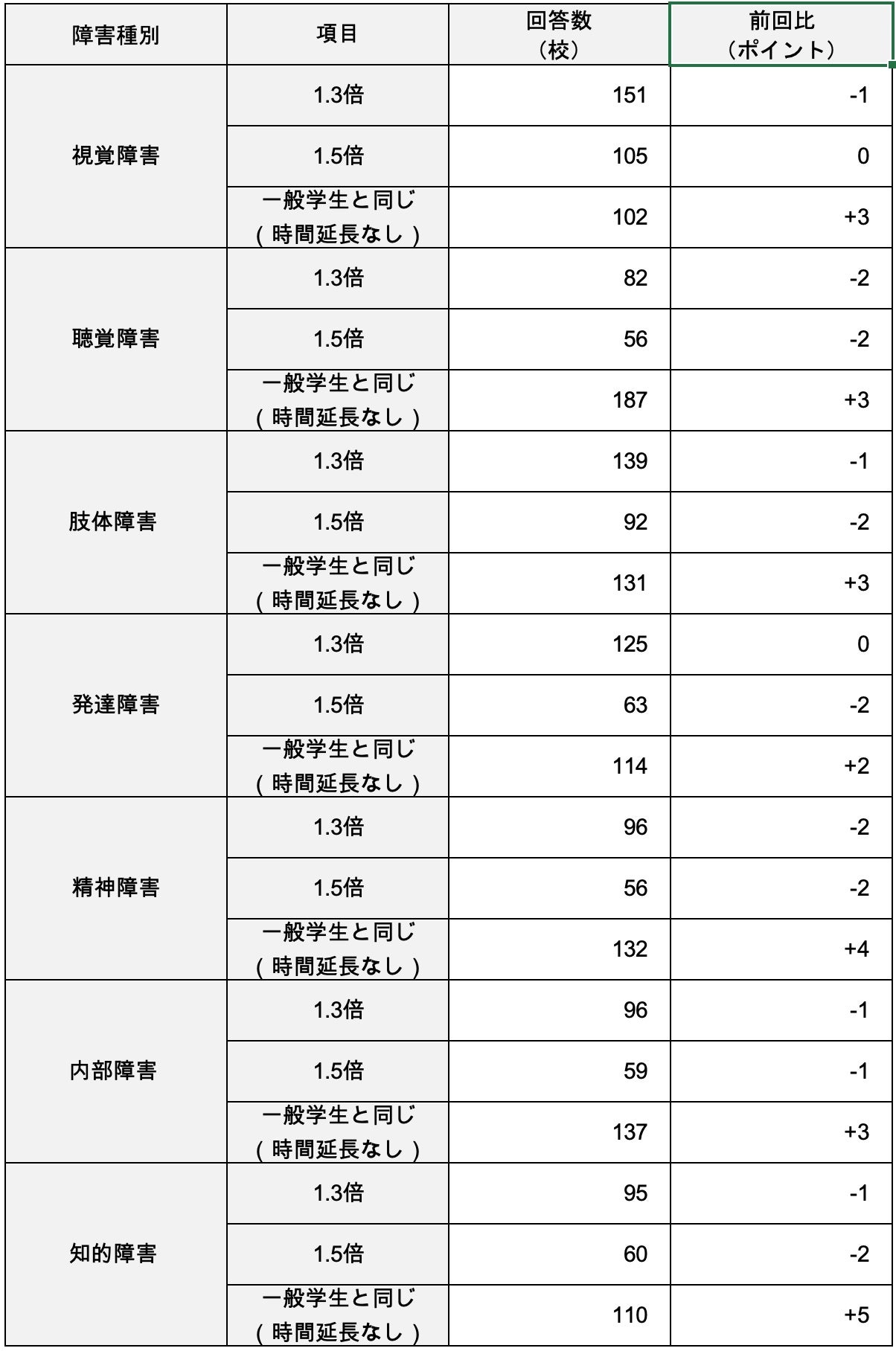 試験時間の配慮では「1.3倍」「1.5倍」の延長はどの障害種別でもある程度の大学が実施しています。