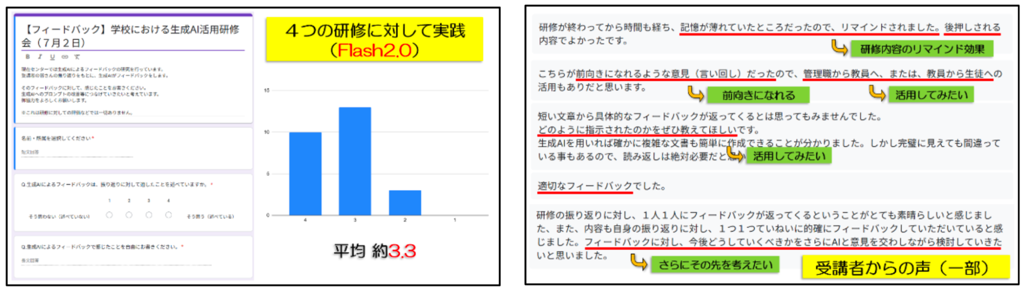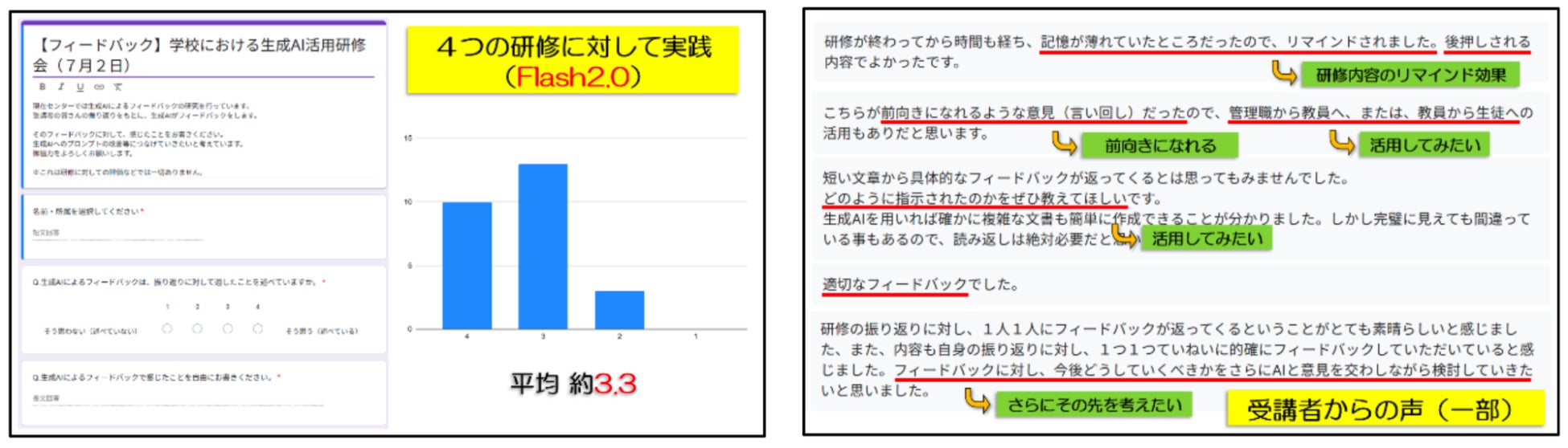 フィードバックの適切性について受講者に調査を行った結果、受講者評価で 3.3(4 点満点)と受容性が確認されています。