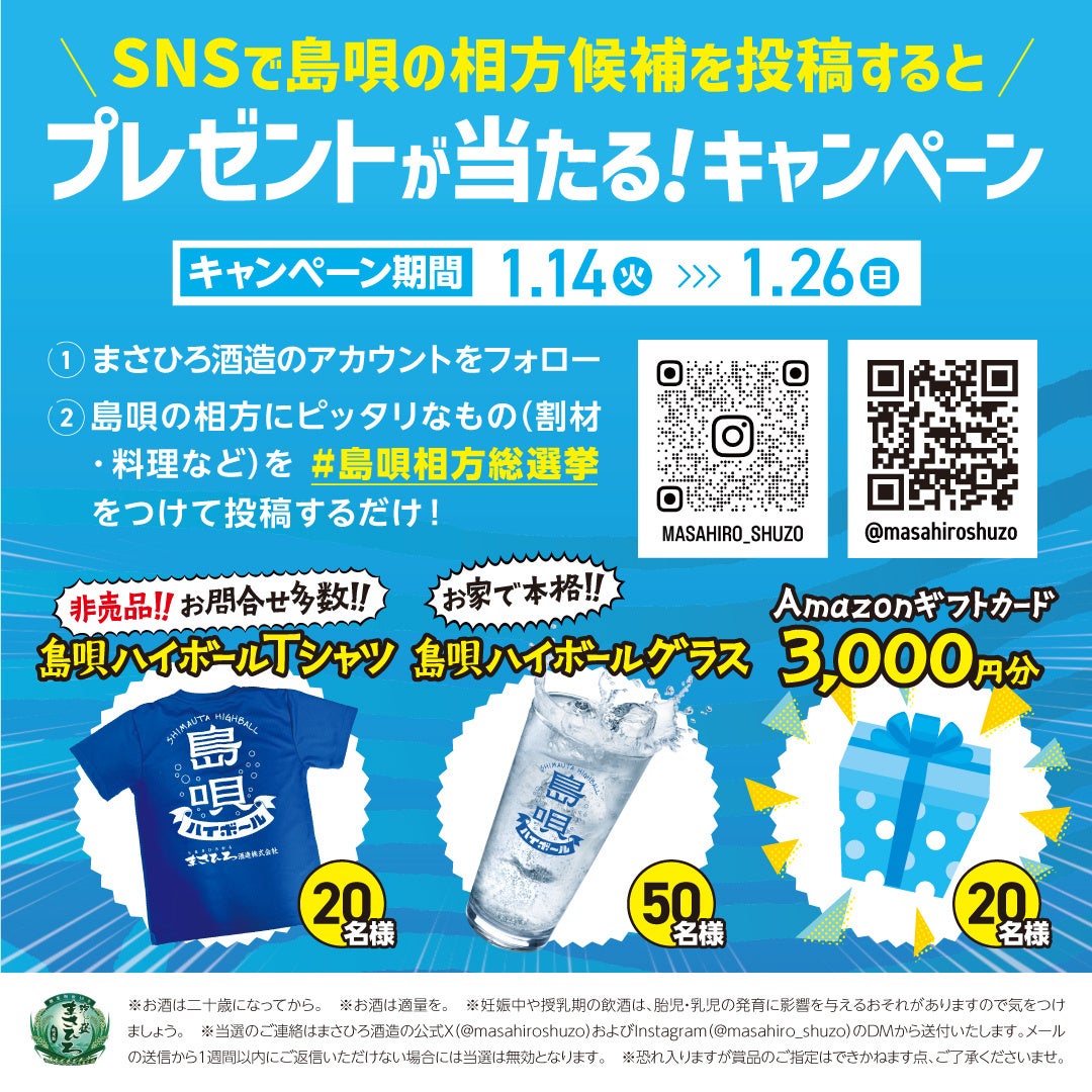 さらに、相方候補を投稿していただいた方には抽選でまさひろ酒造オリジナルグッズの「島唄ハイボールTシャツ」や「島唄ハイボールグラス」、また「Amazonギフトカード」が当たるキャンペーンも実施します。ぜひご参加ください。