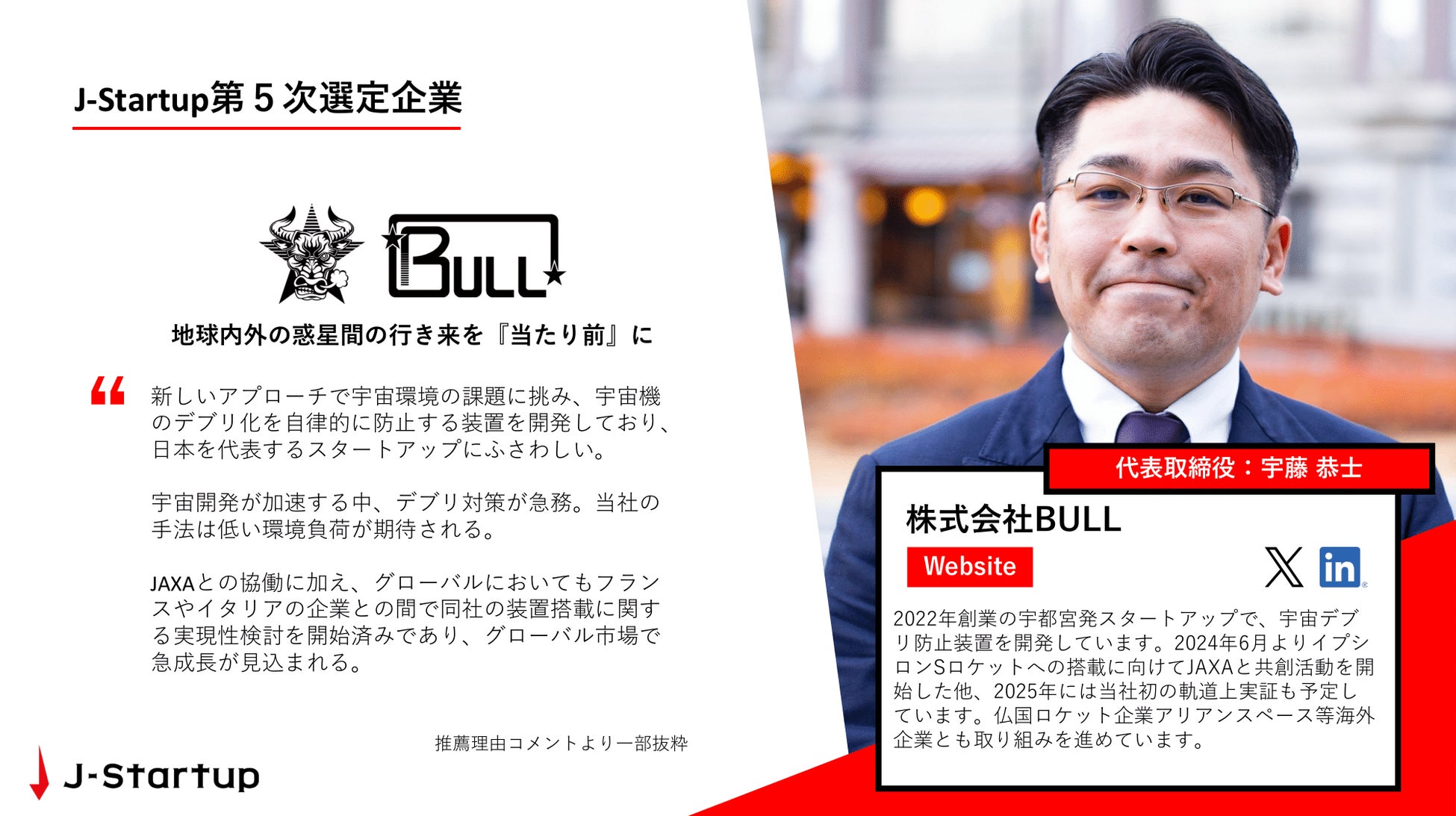 株式会社BULL(栃木県宇都宮市、代表取締役/CEO:宇藤恭士(うとうやすひと)、以下BULL)が、経済産業省によって推進されるスタートアップ企業の育成支援プログラム「J-Startup」に選定されたことをお知らせします。J-Startup 事務局(経済産業省・JETRO・NEDO)による各種支援を通じて、欧州の宇宙市場における動向の把握とネットワークの構築を強化し、栃木発のスペースデブリ拡散防止装置のグローバル展開を加速させます。