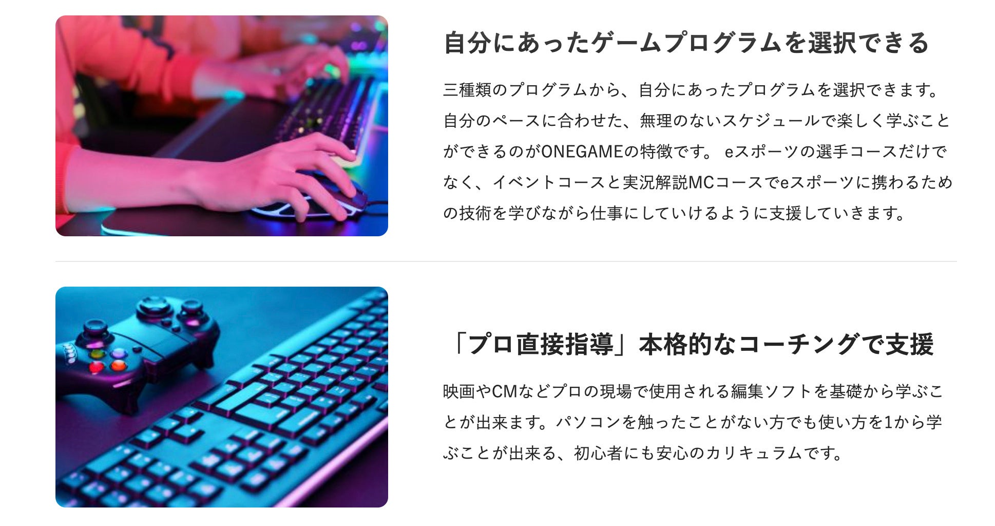 ONEGAMEでは、【選手】【イベント運営】【実況解説】の3つのコースから、eスポーツにどのように携わりたいかを選択します。それぞれのコースでは、プロが直接指導するコーチングを採用し、「好きを仕事にする」ために必要な技術・企画力などを養い、日本だけでなく、ゆくゆくは世界で通用する人材を目指す事が可能です。eラーニングを利用したリモートサポートも完備しております ので、個人の状況やペースに合わせた無理のないスケジュールで楽しく学べる環境をご用意しています。