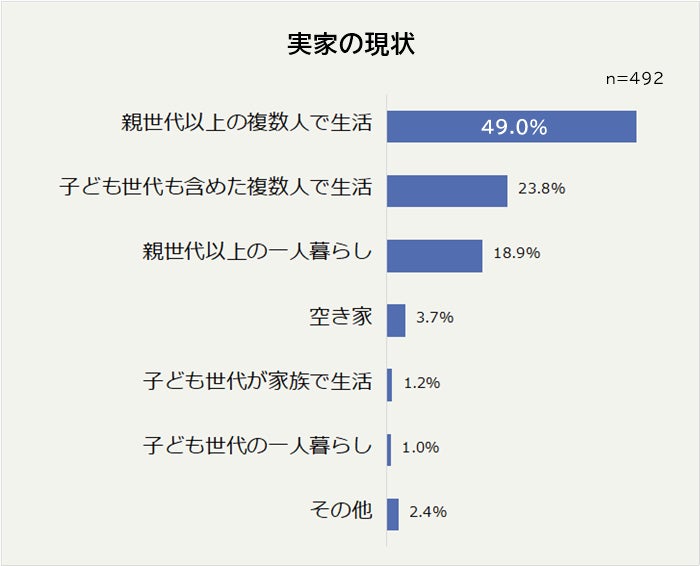 実家がある492人に「実家の現状」を聞いたところ、「親世代以上の複数人で生活」が49.0%で、半数近くにのぼりました。具体的には「両親二人だけで住んでいる」「親と祖母が住んでいる」などです。