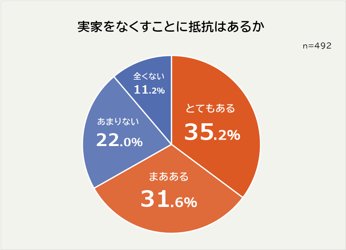 「実家をなくすことに抵抗はあるか」という問いには、「とてもある」「まあある」と回答した人が合わせて66.8%。7割近い人が実家をなくすことに抵抗感を抱いているとわかります。