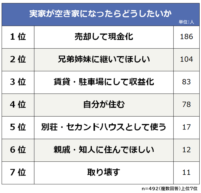 最後に「実家が空き家になったらどうしたいか」を聞いたところ、圧倒的1位は「売却して現金化(186人)」でした。