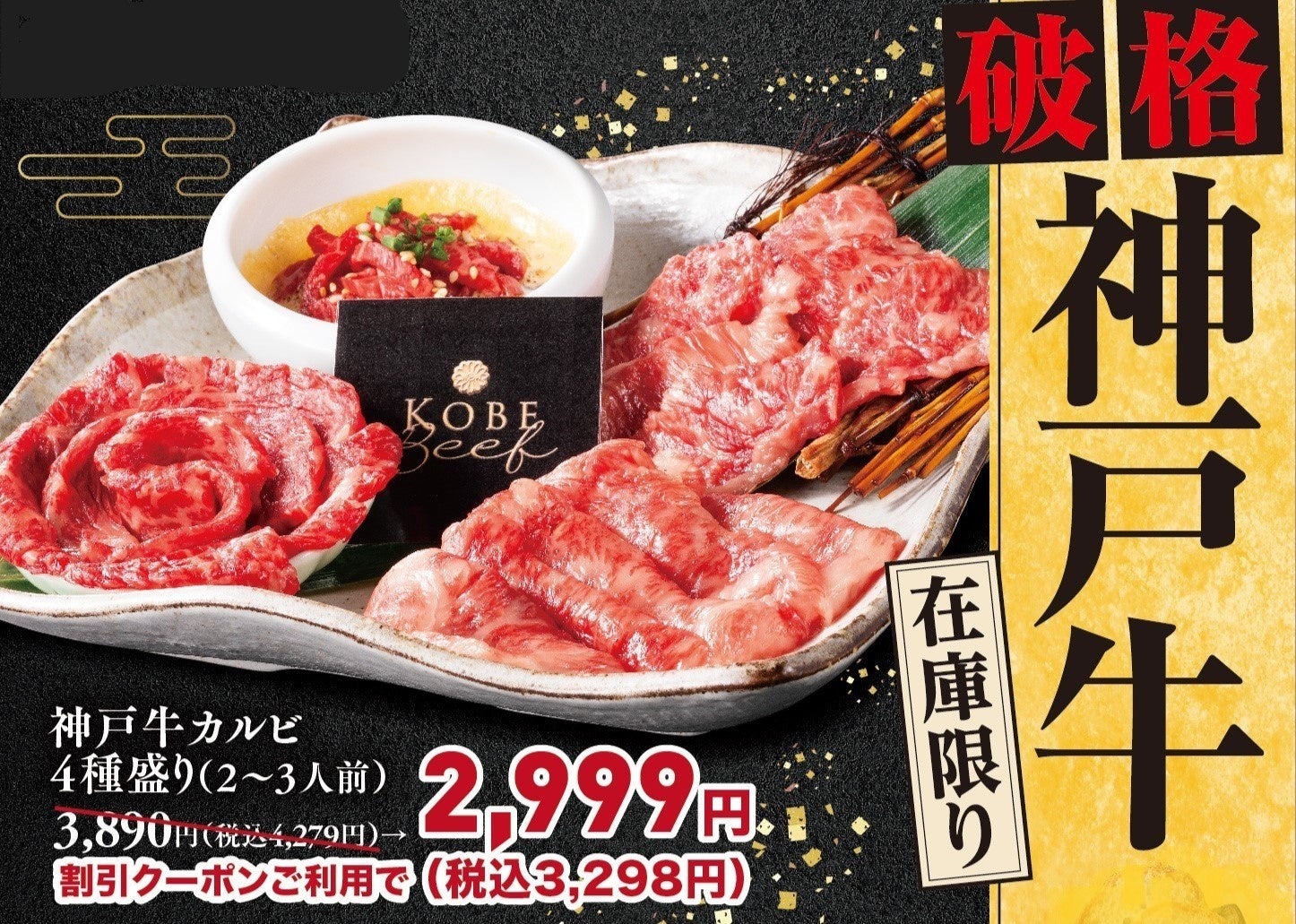 eatopiaが展開する「ギュウトピア」「肉匠みちば」両店舗で"特上カルビ/上カルビ/中落ちカルビ"の神戸牛カルビ3種と、生食用食肉加工の基準を満たした店舗でしか提供することができない"ユッケ(お好みで神戸牛ロースに変更できます)"の合計4種盛りを目一杯の価格、3,890円(税込4,279円)で発売します。更に、12月8日より店頭にて配布するチラシおよびLINE公式に友達登録していただいているお客様には2,999円(税込3,298円)でお召上がりいただけるクーポンをご提供。年末年始の自分へのご褒美に、今しかできない"破格値"で神戸牛カルビをご提供いたします。