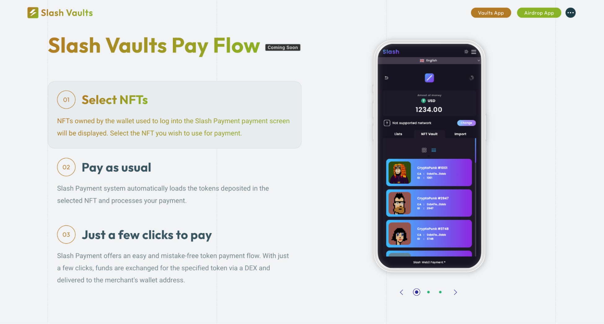将来的な開発提供を予定する「Slash Vaults Pay」では、ユーザーがウォレットで保有しているNFTをアクセスキーとした新しい暗号資産決済の実現とともにネイティブトークンを必要としない「ガスレスPay」機能の実装を予定しております。 「Slash Vaults」を活用した「ガスレスPay」は、従来的なネイティブトークンが必要とされる暗号資産領域のカルチャーそのものを変革することを目的に開発の構想がなされ、より本質的なブロックチェーン技術の社会実装を実現することを目指しています。