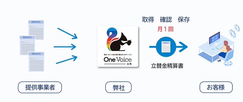 OneVoice公共が、電気・ガス・水道のサービス提供事業者の請求をまとめて支払い、「立替金清算書」を発行します。