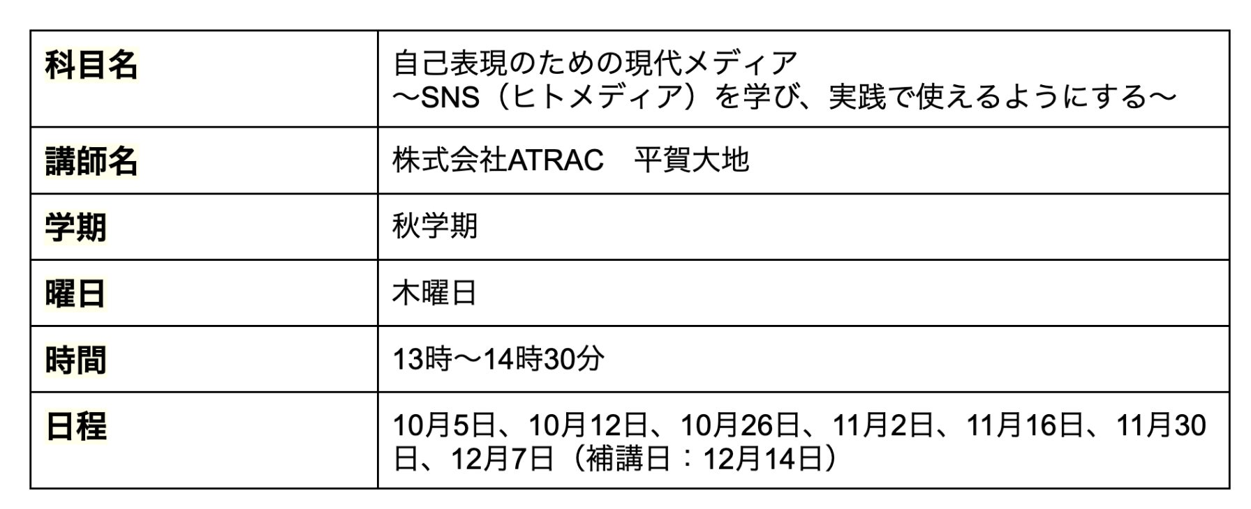 デジタルを中心としたマーケティング支援を展開する株式会社ATRAC(東京都渋谷区、代表取締役社長:三和 大輔)執行役員 兼 SNSマーケティング本部長の平賀 大地は、2023年10月~12月、早稲田大学 Life Redesign Collegeにて、専門科目群/Communication(コミュニケーション)領域/「自己表現のための現代メディア」と題し、SNS(ヒトメディア)に関する講義を全7回にわたり開催します。
