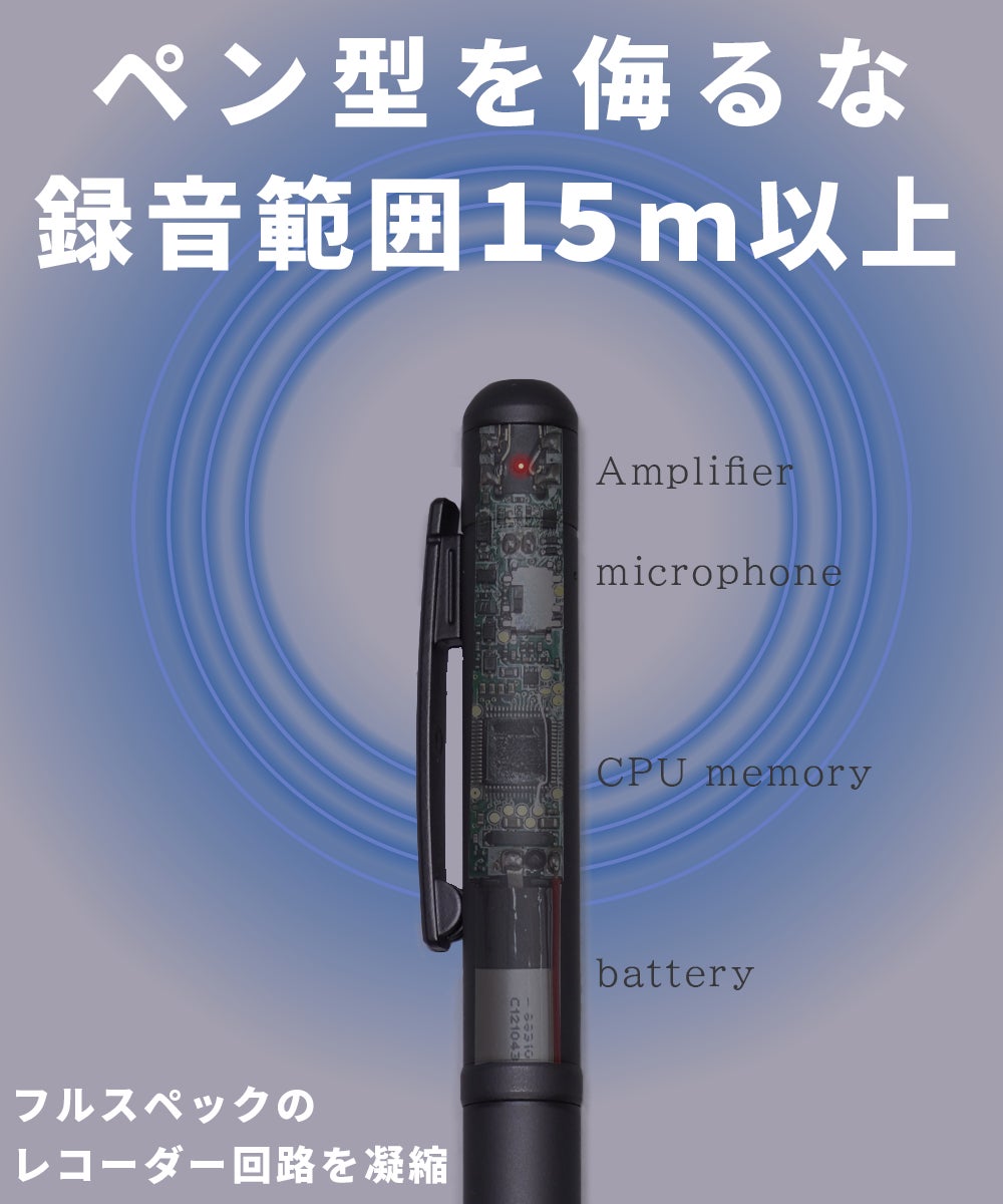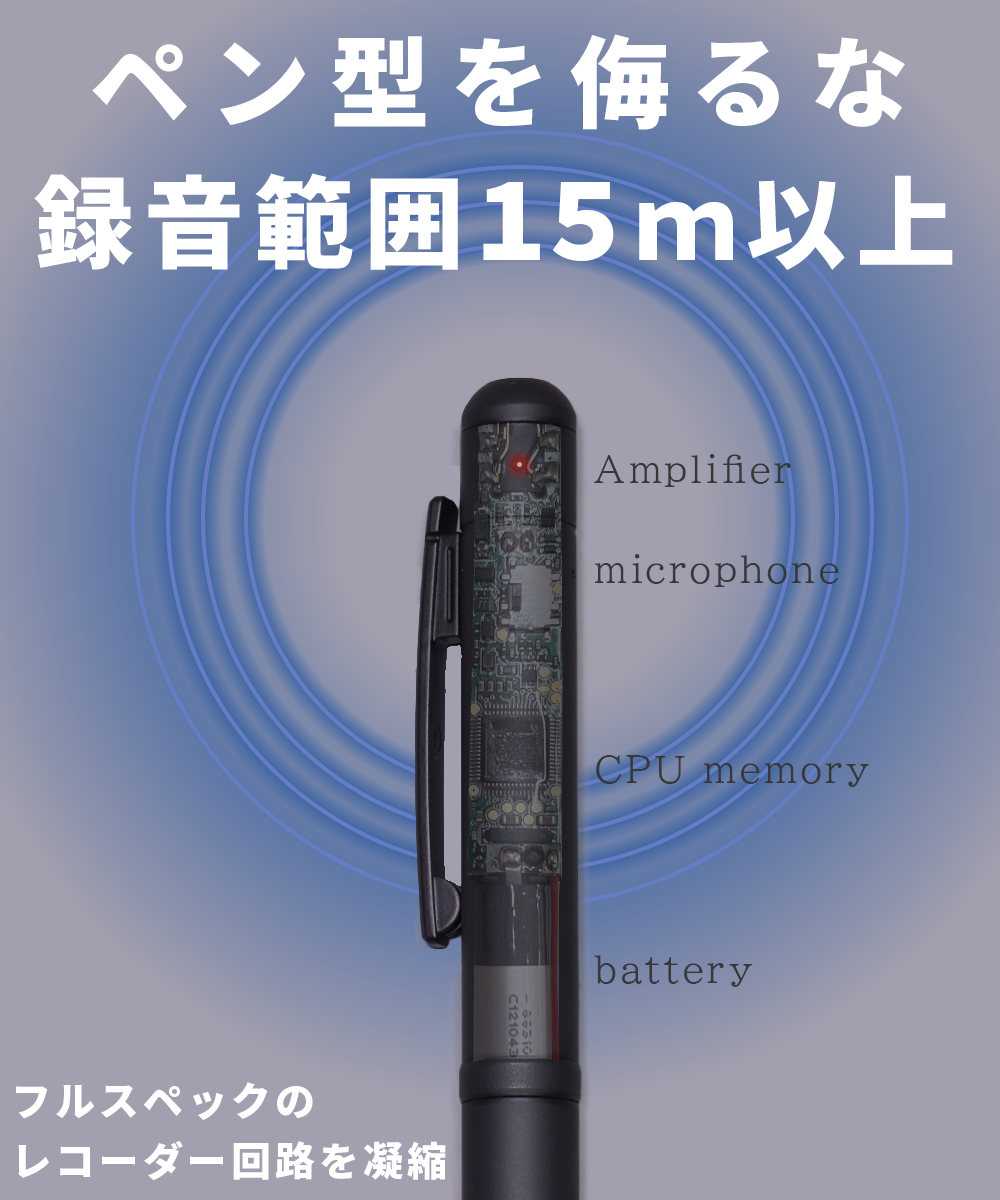 ペン型ながら内部に収納されたボイスレコーダー性能は本格的であり、近距離の録音から遠距離の録音までしっかり録音ができます。