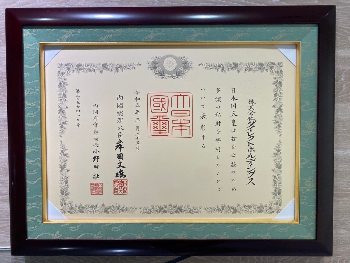 なお、上記の内容が功績として認められ、2023年5月23日(火)に、福岡市より紺綬褒章の伝達、及び表彰を受けました。