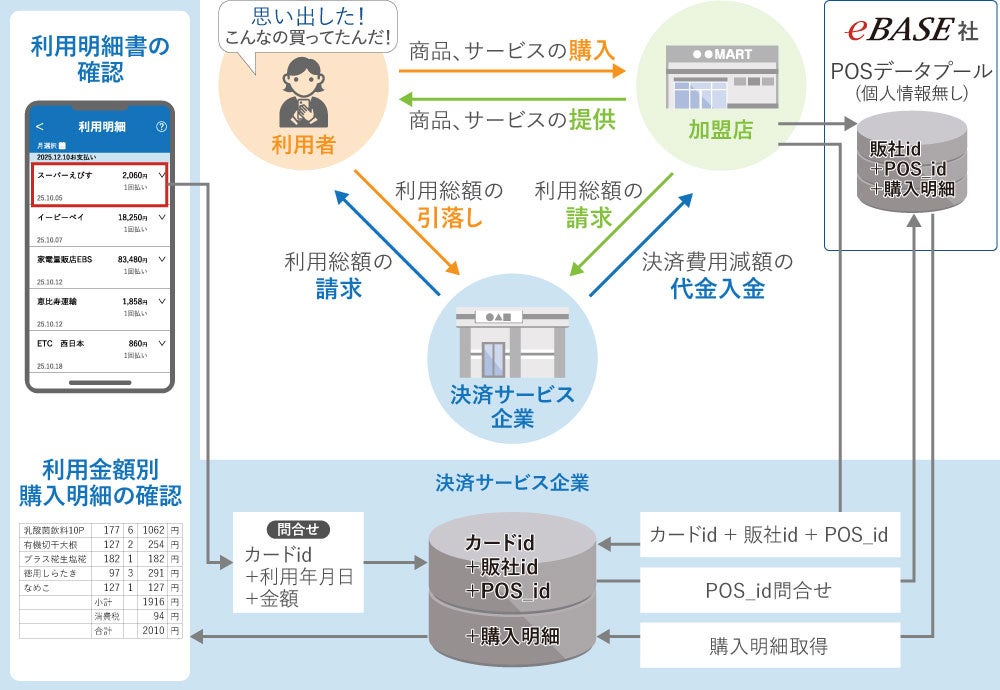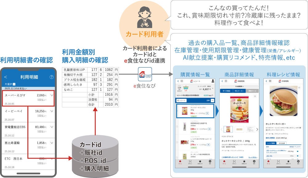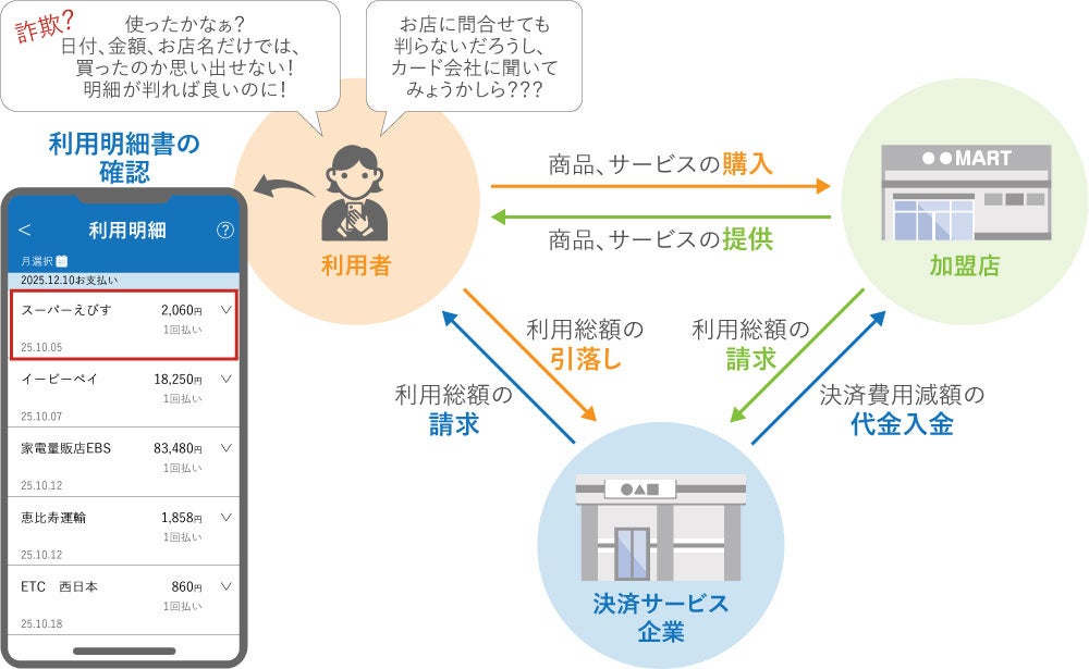 ユーザーはスマートフォンなどで利用明細を確認でき、「いつ・どこで・いくら」という情報に加え、「何を買ったか」という商品リストも同時に得られ、いつでも簡単に確認できるようになります。