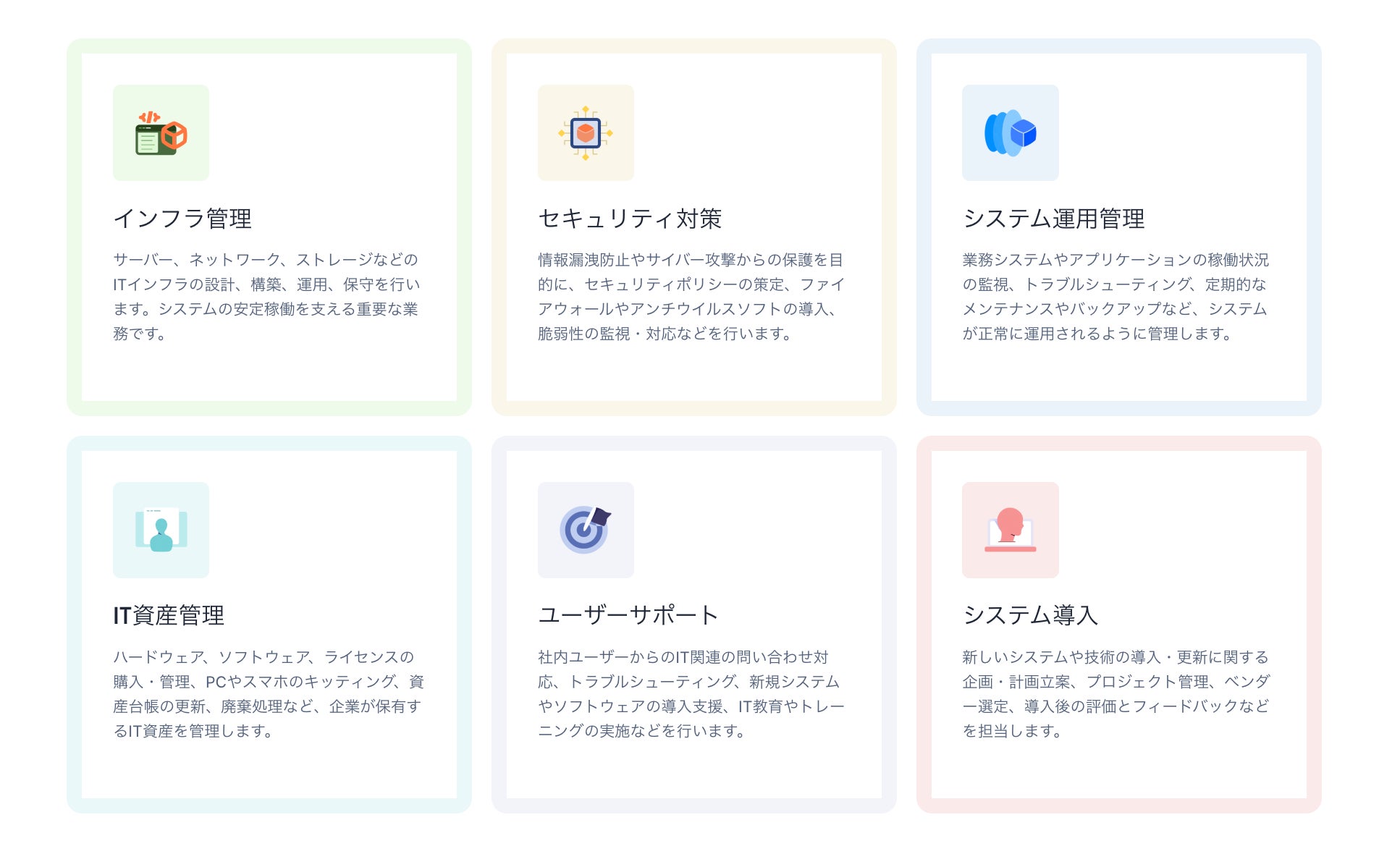 各種クラウドサービス(AWS/Azure/GCP)運用保守・障害対応・NW維持保守・社内グループウェア構築・IT資産管理・ソフトウェアバージョンアップ対応・BCP対策・PC/スマホキッティング・IT/セキュリティ研修 他