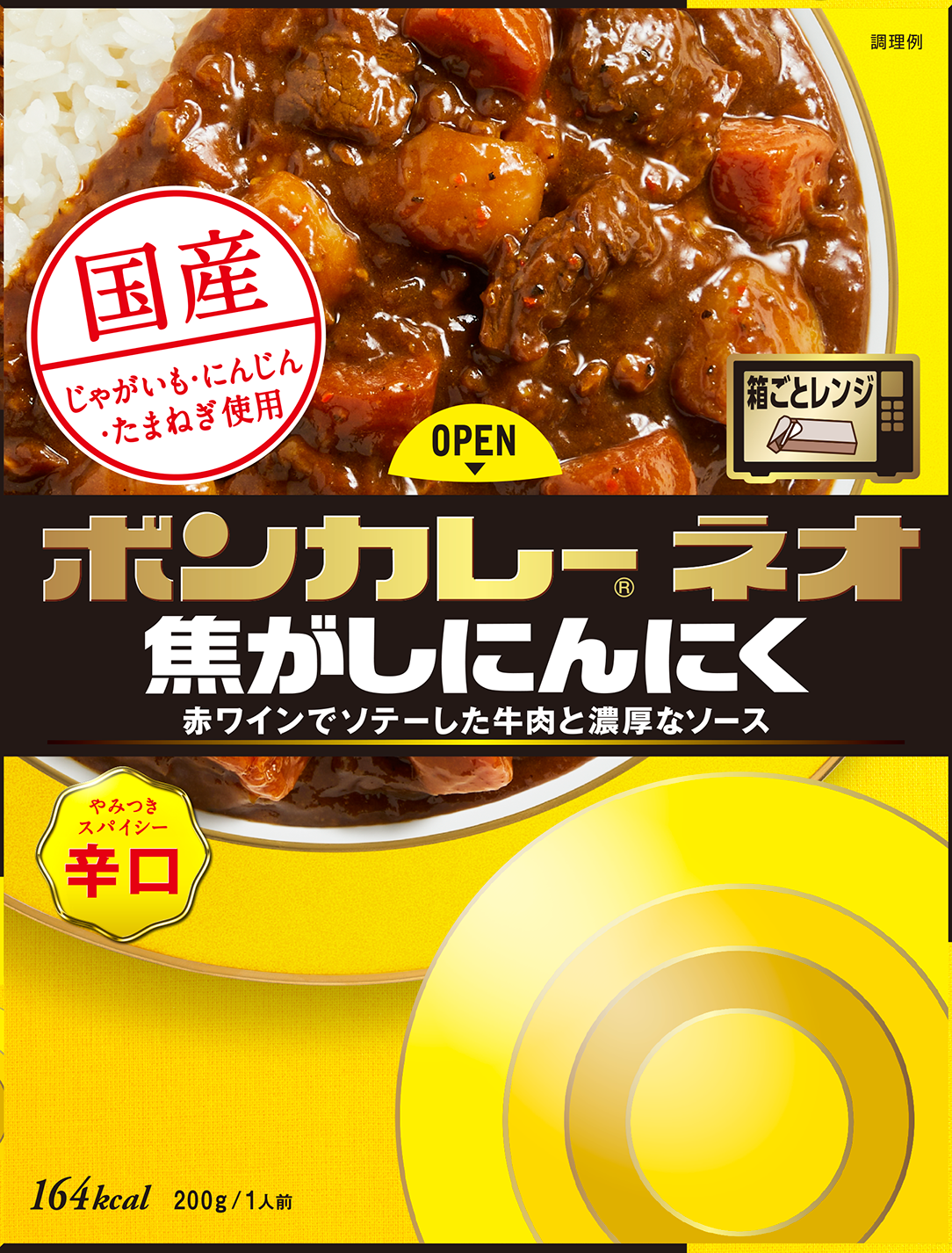 ■製品特長:濃厚なソースと大きなゴロゴロした具材、赤ワインでソテーした牛肉の旨み。国産じゃがいも・にんじん・たまねぎ使用。箱ごとレンジ調理可能。