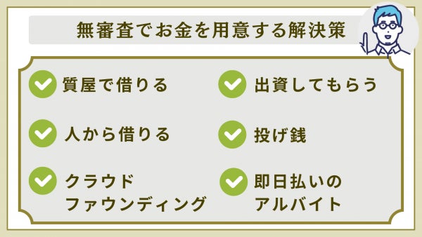 無審査でお金を用意する解決策は、下記の6つです。