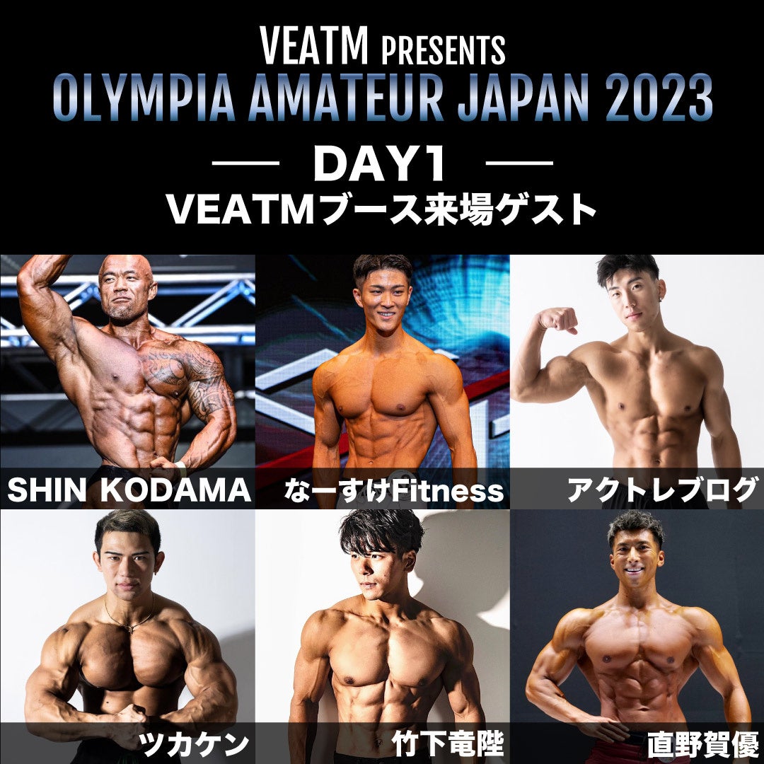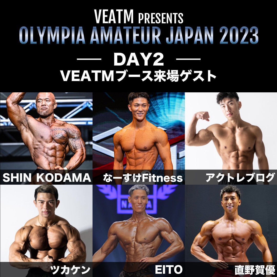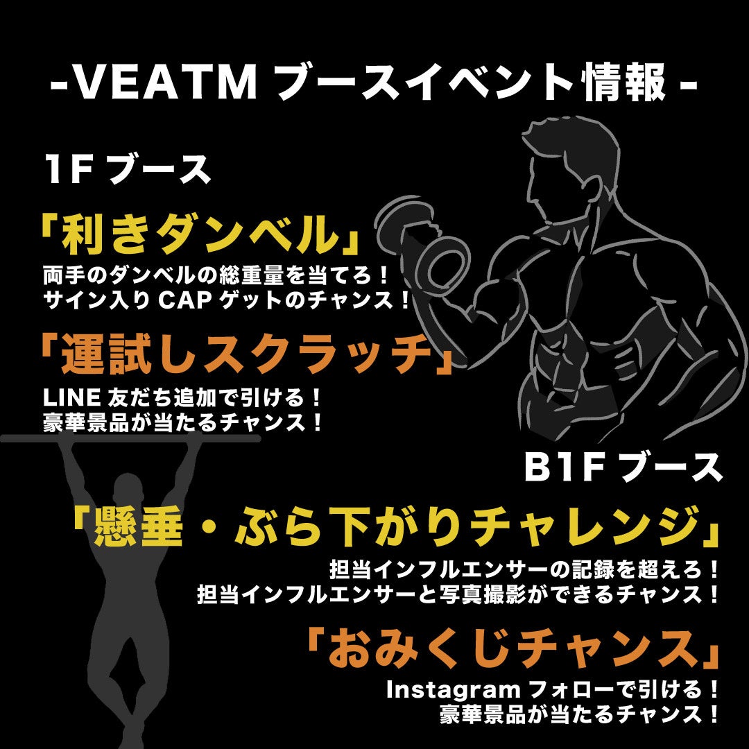 3日間の開催中、国内トップフィジーク選手や、人気インフルエンサーがスペシャルゲストとして日替わりで来場、写真撮影や様々なイベントに一緒に参加可能です。どなたでもご参加可能な「VEATMチャレンジ企画」に是非挑戦くださいませ。チャレンジ企画に成功した方には、VEATMアスリートより豪華賞品をプレゼント。トレーニングや運動がお好きな方が楽しめるコンテンツが盛りだくさんです。ぜひVEATMブースにご来場ください。