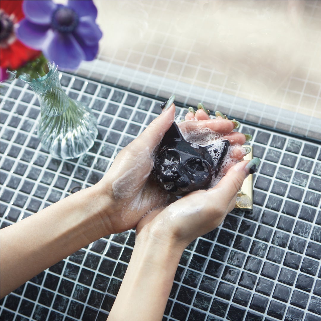 オーガニック成分や植物由来の原料に炭を配合した、贅沢な猫型美容石鹸です。