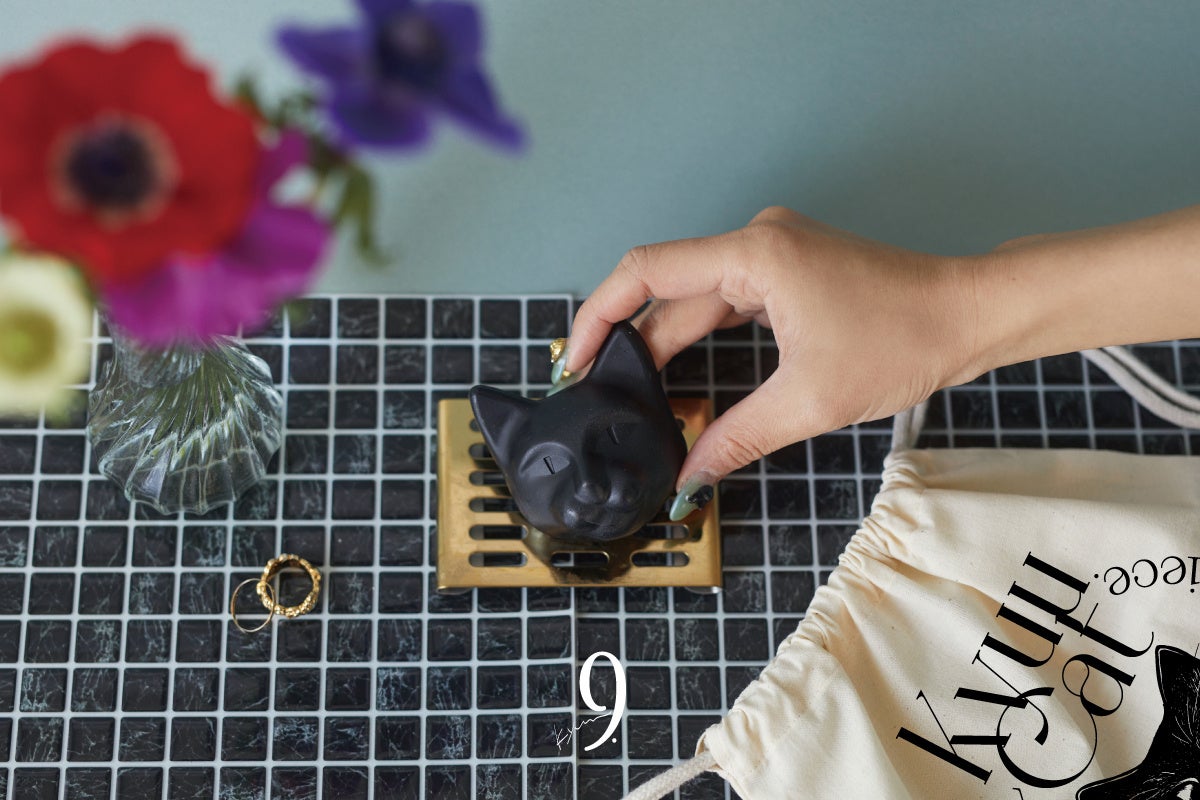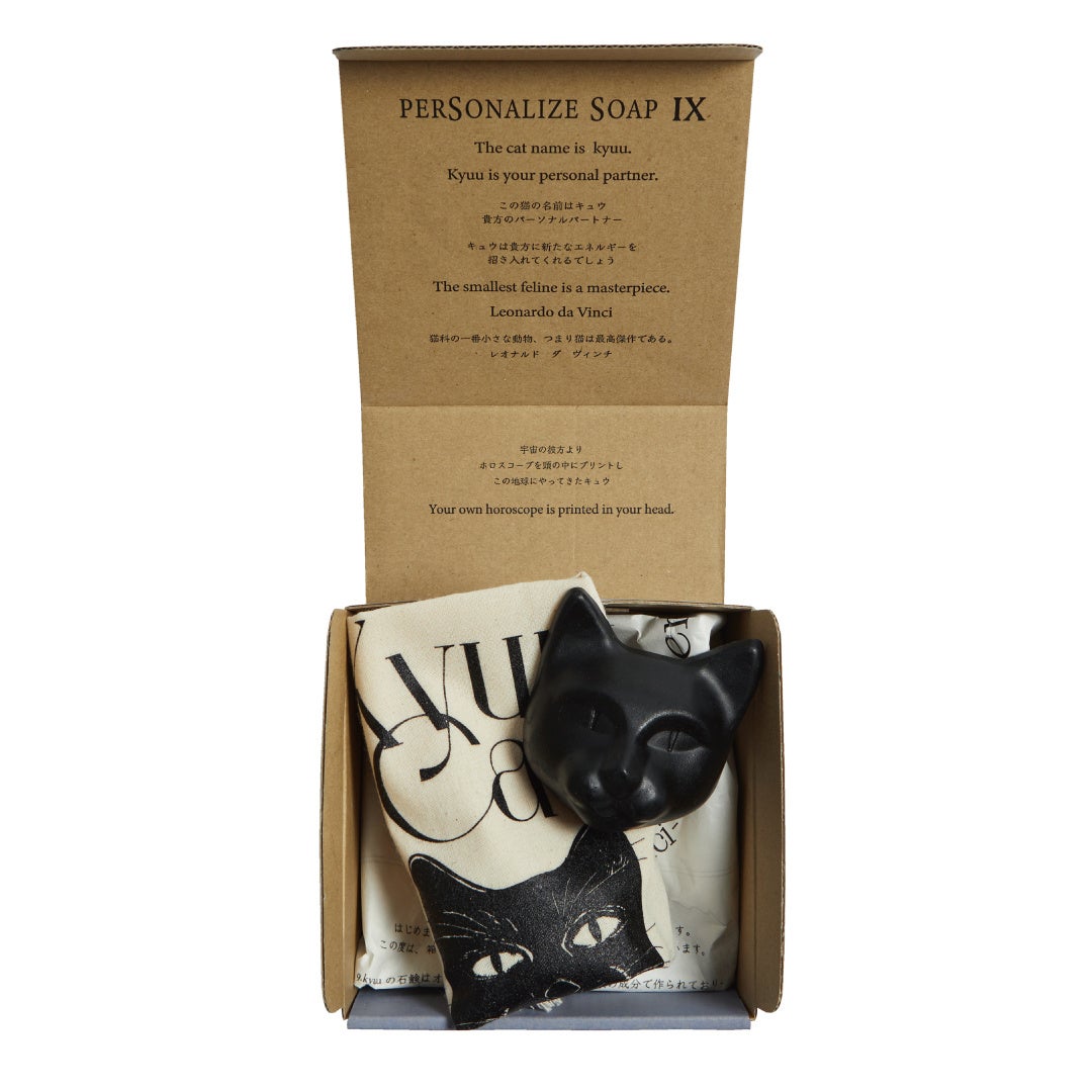 炭を贅沢に配合した『ハコイリ炭黒ネコ石鹸』と9.kyuuオリジナル猫巾着のスペシャルセット。