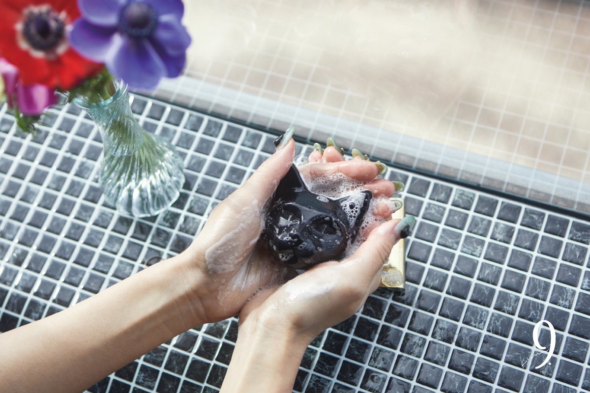 2024年2月22日「ニャンニャンニャン」記念!9.kyuuから数量限定!炭を贅沢に配合、イケニャンな『ハコイリ炭黒ネコ石鹸』+オリジナル猫巾着のスペシャルセットが発売!