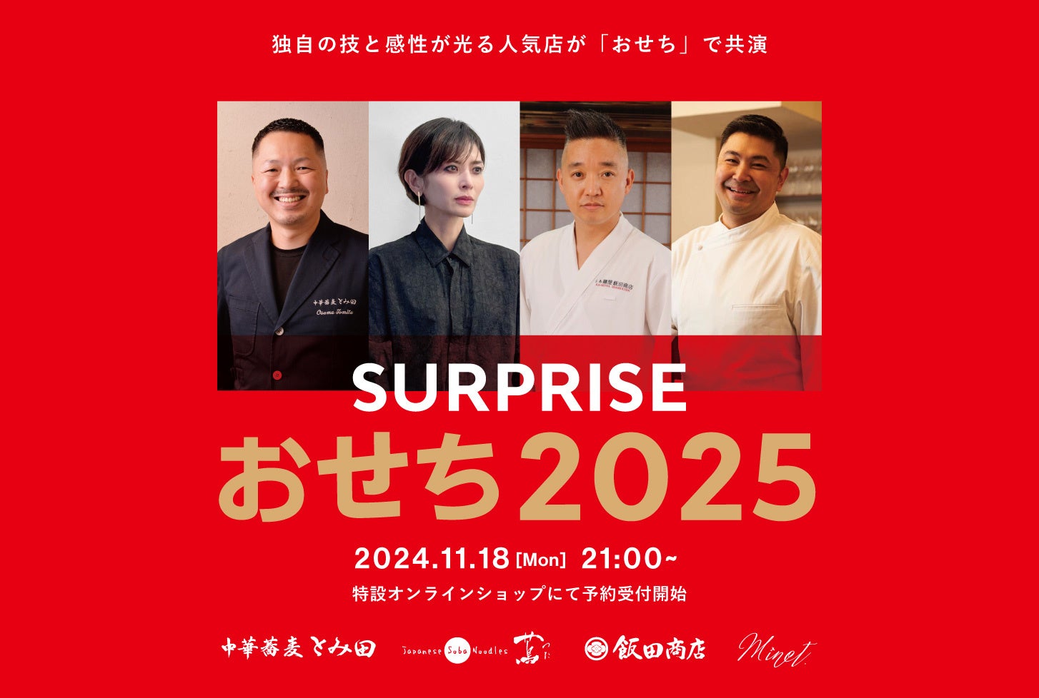 この度、ラーメン業界を代表する3店舗、中華蕎麦とみ田、飯田商店、Japanese Soba Noodles 蔦、Restaurant Minet.が奇跡のコラボレーションを実現。まったく新しいおせち「SURPRISEおせち2025」を、2024年11月18日(月) 21時より、100個限定で販売いたします。
