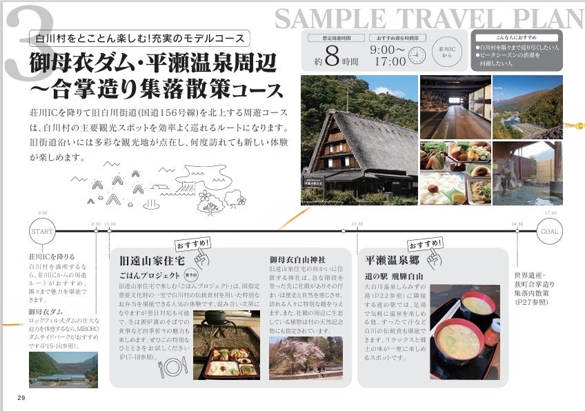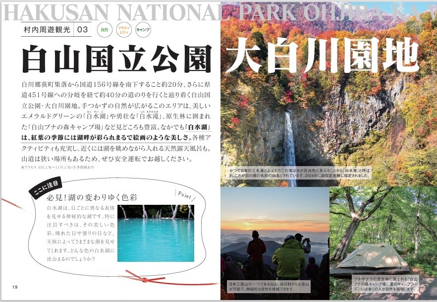 このたび発行した観光ガイドブック「白川郷再発見」は、あまり知られていない白川村全域の魅力を紹介し、周遊観光による分散を促し、主要スポットに集中するのを防ぎながら、より豊かな体験ができるよう工夫を凝らしています。