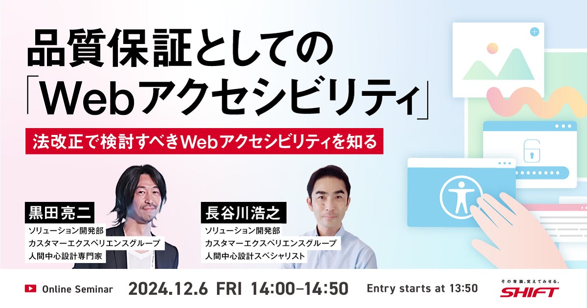 本サービスの提供開始を受け、Webアクセシビリティ対応の必要性や具体的な導入ステップについて解説するオンラインセミナーを開催します。