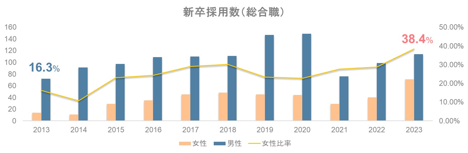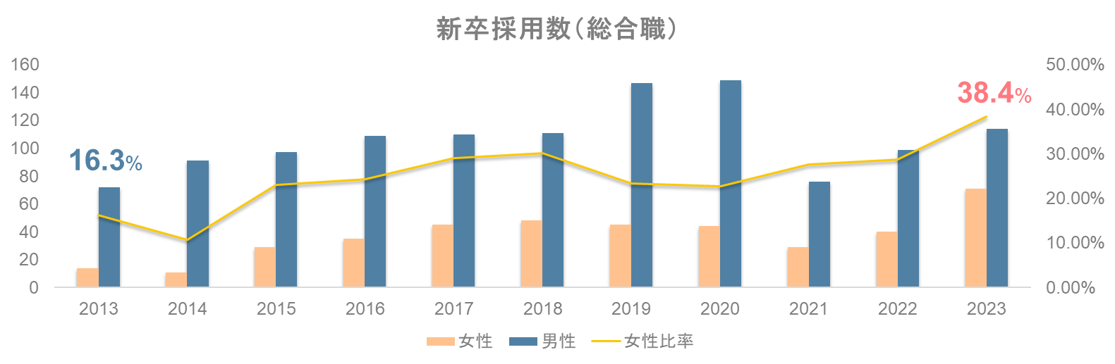 ●新卒総合職における女性比率30%以上(2023年度時点で38.4%まで伸長)