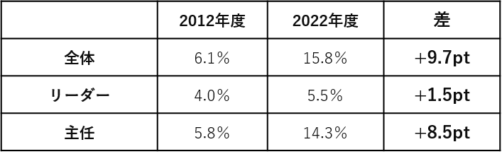 当社では2015年度から新卒の女性総合職の採用数を増やしております。一方で、女性総合職における階層別の女性比率は【リーダー:5.5%】【主任:14.3%】(2022年度)であり、2012年度と比較すると増加しているものの、まだまだ女性活躍の伸びしろがあると考えております。