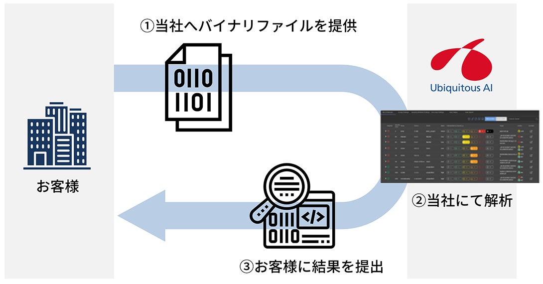 バイナリファイルの解析とSBOMの作成はユビキタスAIが行うため、顧客は自社で解析ツールを購入する必要がなく、かつ短期間でSBOMを取得することが可能となります。
