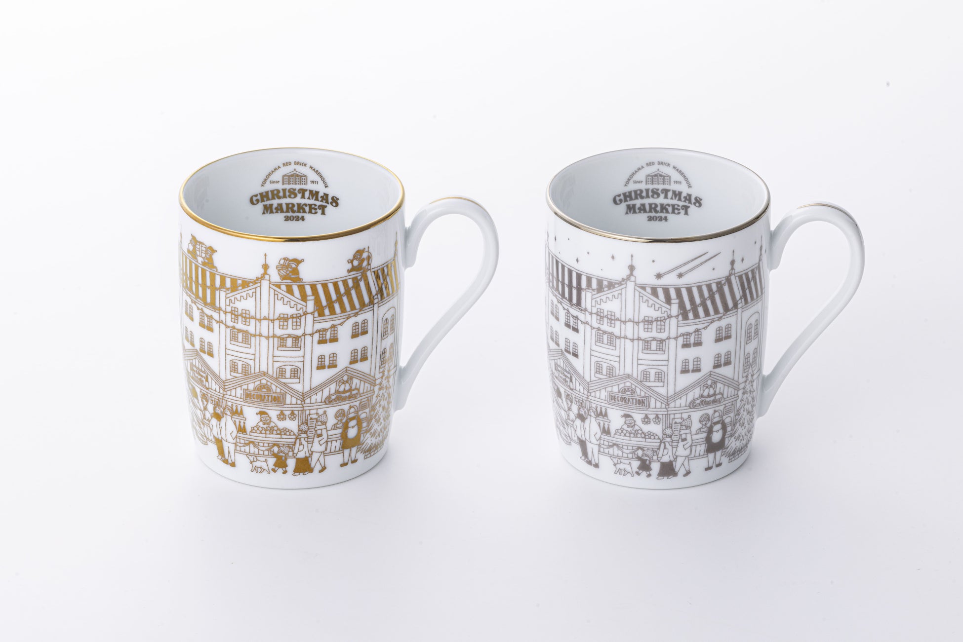 趣のある横浜赤レンガ倉庫とイベントの賑わいを表現したデザインを施しています。屋根の上の絵柄にご注目いただくと金色のマグカップにはサンタたちが慌ててプレゼントを運んでいる様子が描かれ、銀色のマグカップには準備を完了させたサンタが夜空に飛び立っていく様子が描かれています。