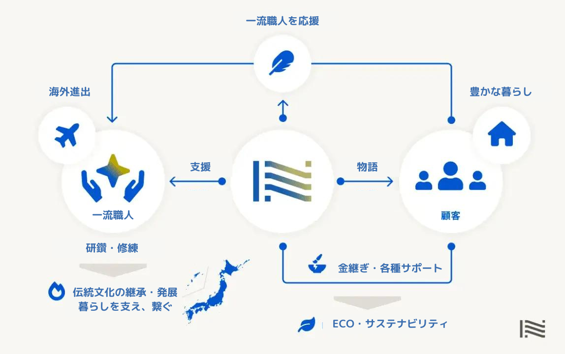 ⻑い時間を経て育み、継承されてきた日本の伝統工芸文化は今、少子高齢化や東京一極集中などの理由により消滅の危機に晒されています。当社はこの文化を維持・継承することで、日本の誇りを守ると同時に、新たなエコシステムを形成し、国内外で更なる発展を遂げるための事業に挑戦しています。