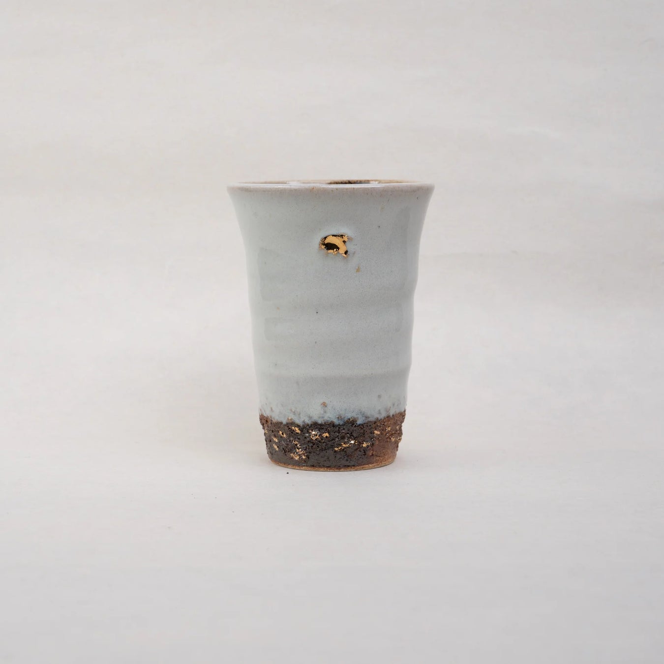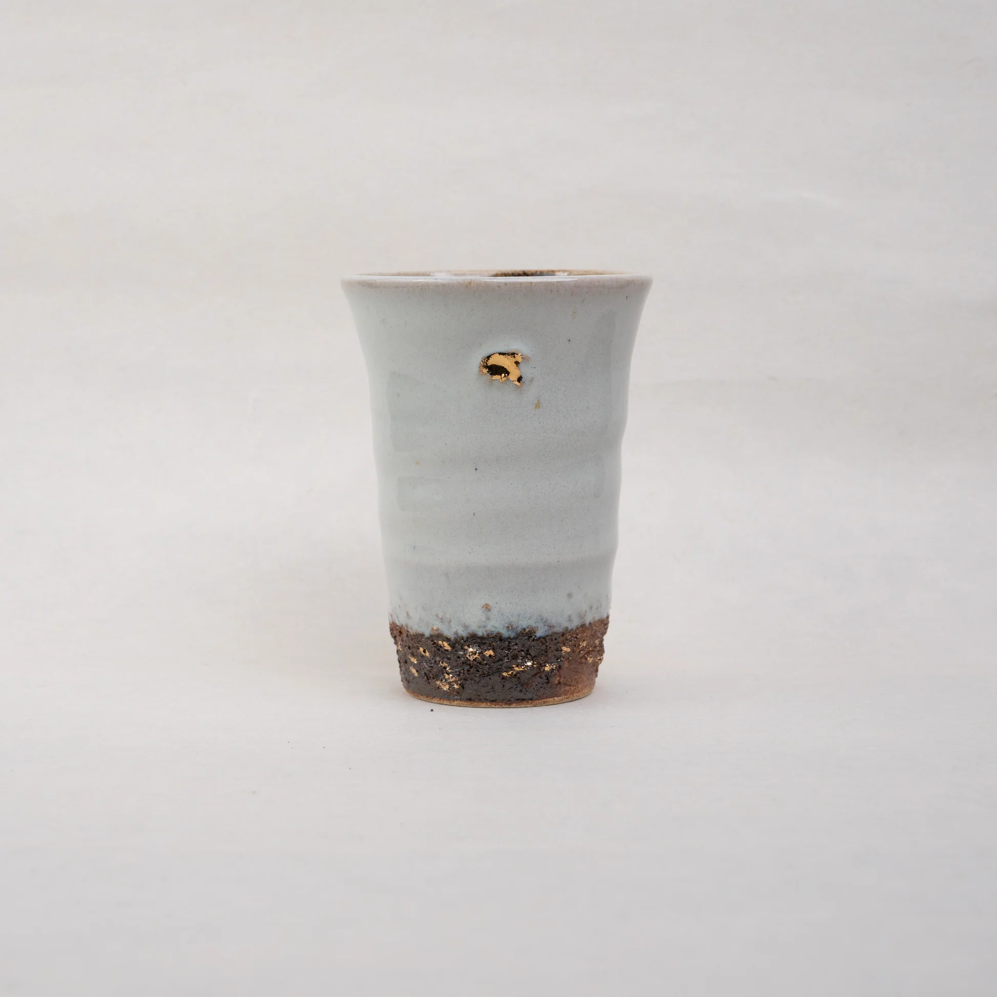 萩焼で使う大道土ベースの粘土を使って製作した作品。釉薬には自らが焼いた田んぼで作った灰をもとに作った藁灰釉を使用。ワンポイントで金彩を施しているところが特徴的。