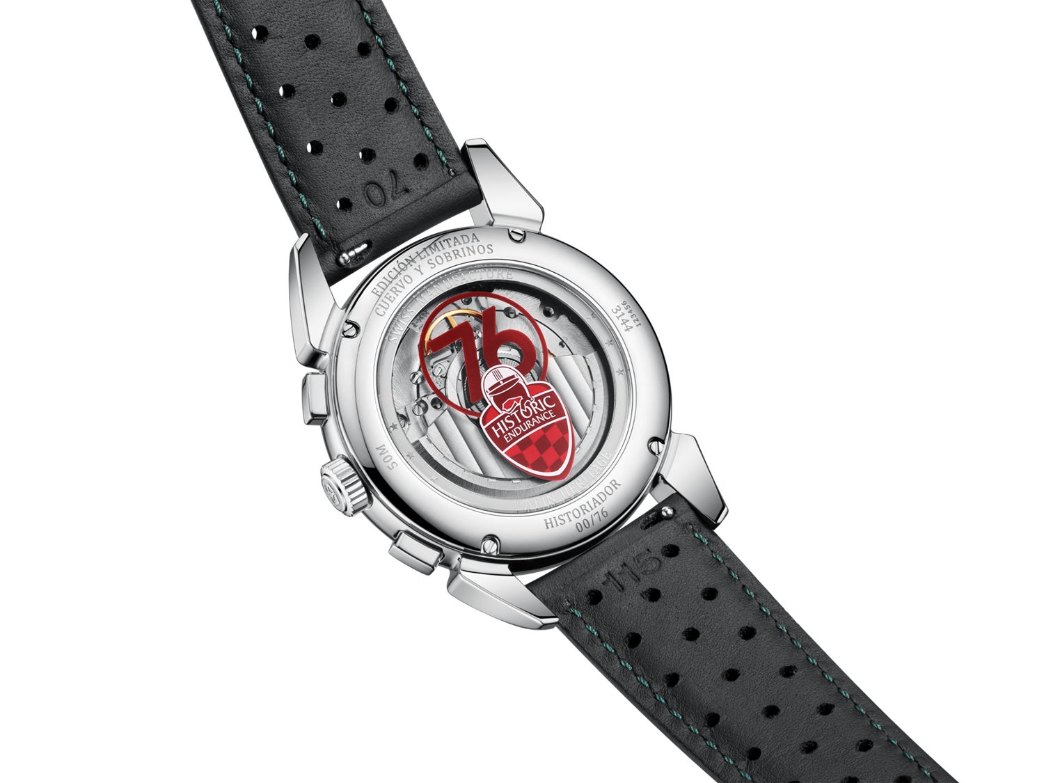 直径40mmのステンレススティール製ケースは、現代のテイストにマッチしています。ケースバックはねじ込み式で、自動巻きキャリバーCYS 8129を眺めることができるサファイアクリスタルを採用。さらに、クリスタルには「Historic Endurance」のオフィシャルロゴと「76」(限定生産数)の数字があしらわれています。