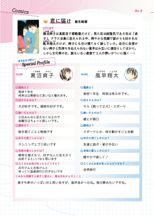 例えば、『君に届け』のページの「これから同棲する爽子と翔太に、椎名先生からひとこと」には「爽子も幸せいっぱいだと思いますが、風早良かったね。毎日夢みたいですね。」というメッセージが記載されています。