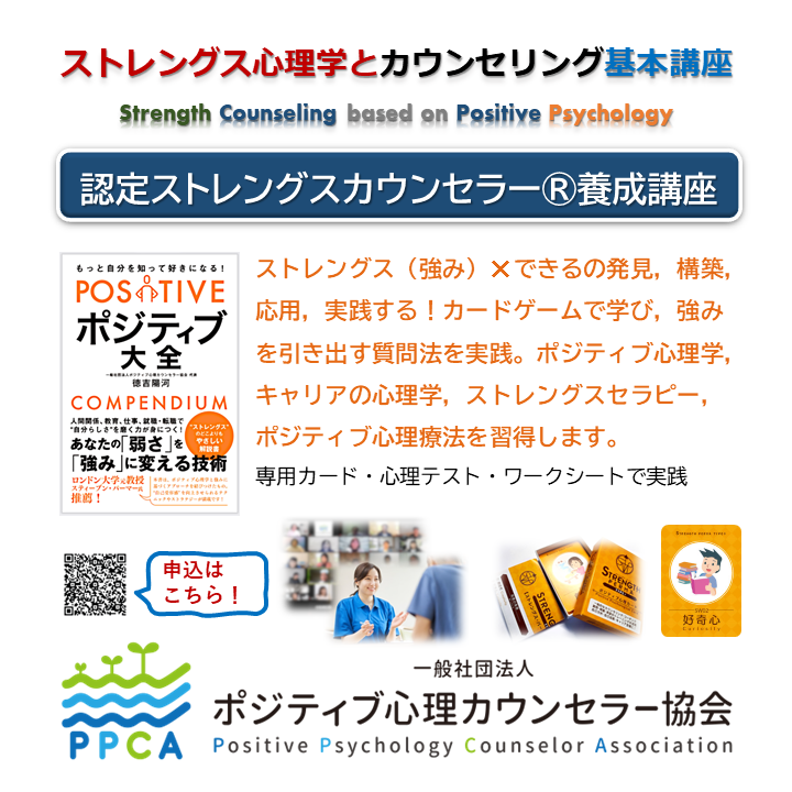 一般社団法人 ポジティブ心理カウンセラー協会(本部:東京都港区)が主催、一般社団法人コーチング心理学協会が共催し,【2023年10月21-22日(土日)】9:00~ 17:30(2日間・両日)オンライン・ワークショップにて,【ストレングスカウンセラー基本講座」を開催いたします。オンラインですので,国内・海外から参加することが可能です。