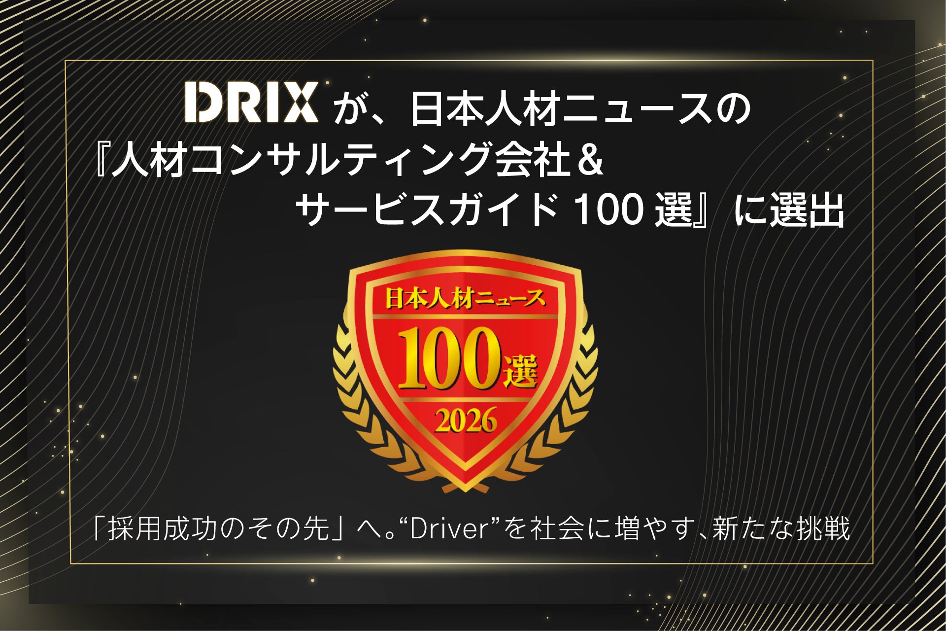 株式会社DRIX(本社:東京都豊島区、代表取締役:長谷川優、以下「DRIX」)は、人事関係者から推薦を受けて選定される『人材コンサルティング会社・サービスガイド100選』(発行:日本人材ニュース)2026年度版に選出されました。