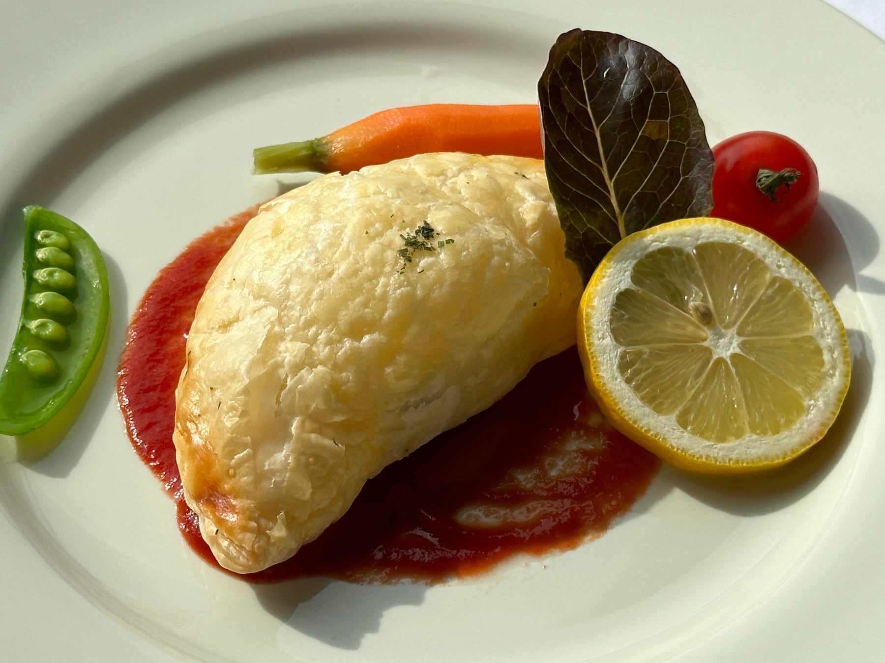 北海道産のとうもろこしとしめじを使用し、牛乳を加えて具材のソースを一度加熱した後にパイで包みました。パイに焼き目が付き、具が温まればすぐに食べられる商品です。洋食の焼物として、また修学旅行向けのメニューにもおすすめです。冷凍のまま約12分焼いてからお召し上がりください。