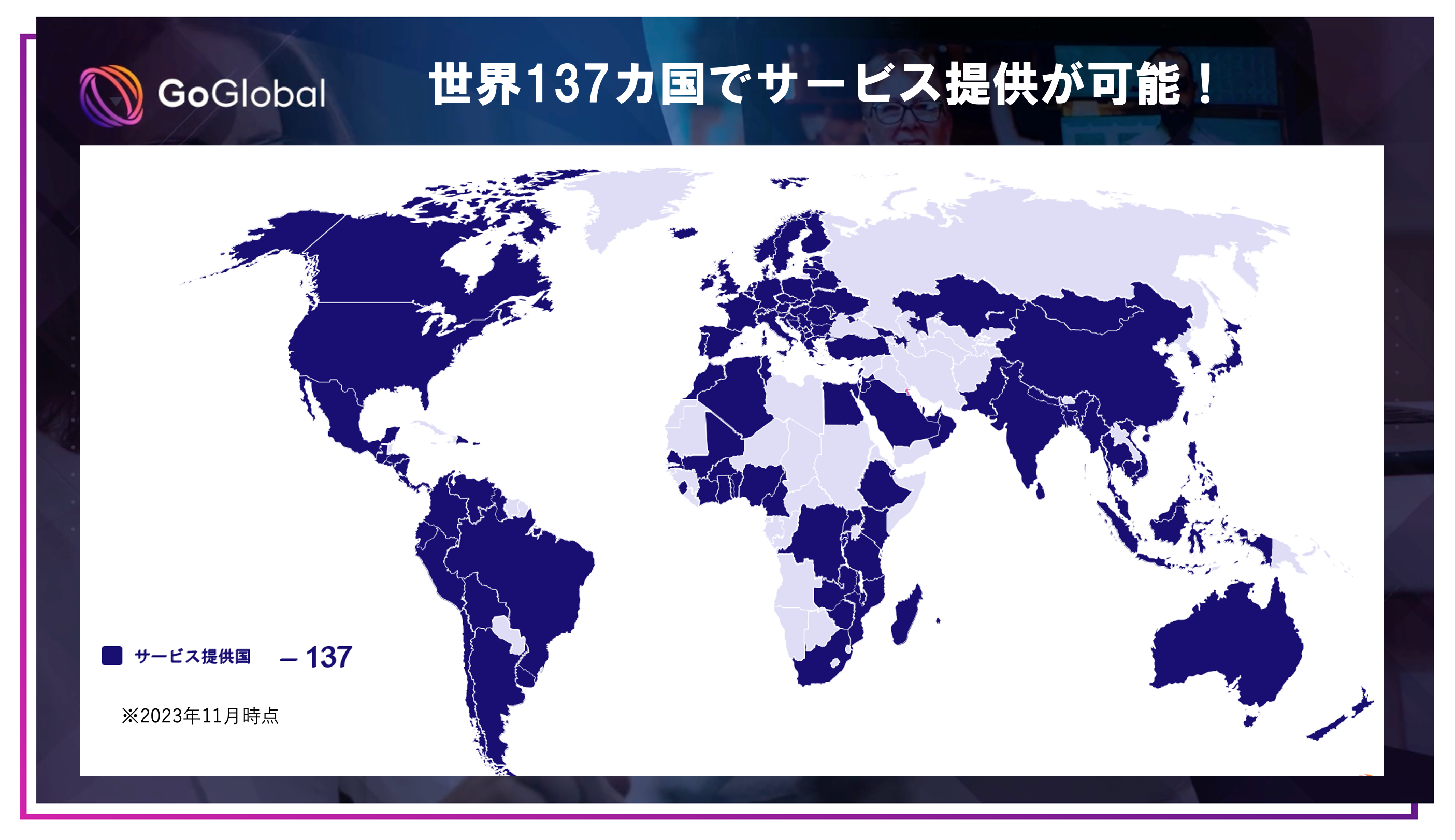 GoGlobalは日本企業初の海外雇用代行サービス (EOR=Employer of Record) 会社として2018年に設立。現在、世界80カ国以上でサービス展開に成功し、日本企業の海外進出をサポートし続けるEORのスタートアップ企業です。EOR は、世界各国で優秀な人材を現地法人設立せずに雇用することを可能にし、従来型の海外進出において発生する費用・時間の大幅な削減をしながら、最短2週間で海外進出・海外雇用ができるサービスです。リクルーティングサービスも提供しており、事業ニーズに合わせて各国で適切な人材の求人、雇用・人事管理まで一気通貫のサポートが可能です。各国のコンプライアンスを順守し、バックオフィス業務を不要にし、クライアントのコアビジネスの成長に注力できる体制を提供できる事も私たちの強みです。GoGlobalはこれからの時代の海外人材雇用の新しいスタイルを提案していきます。