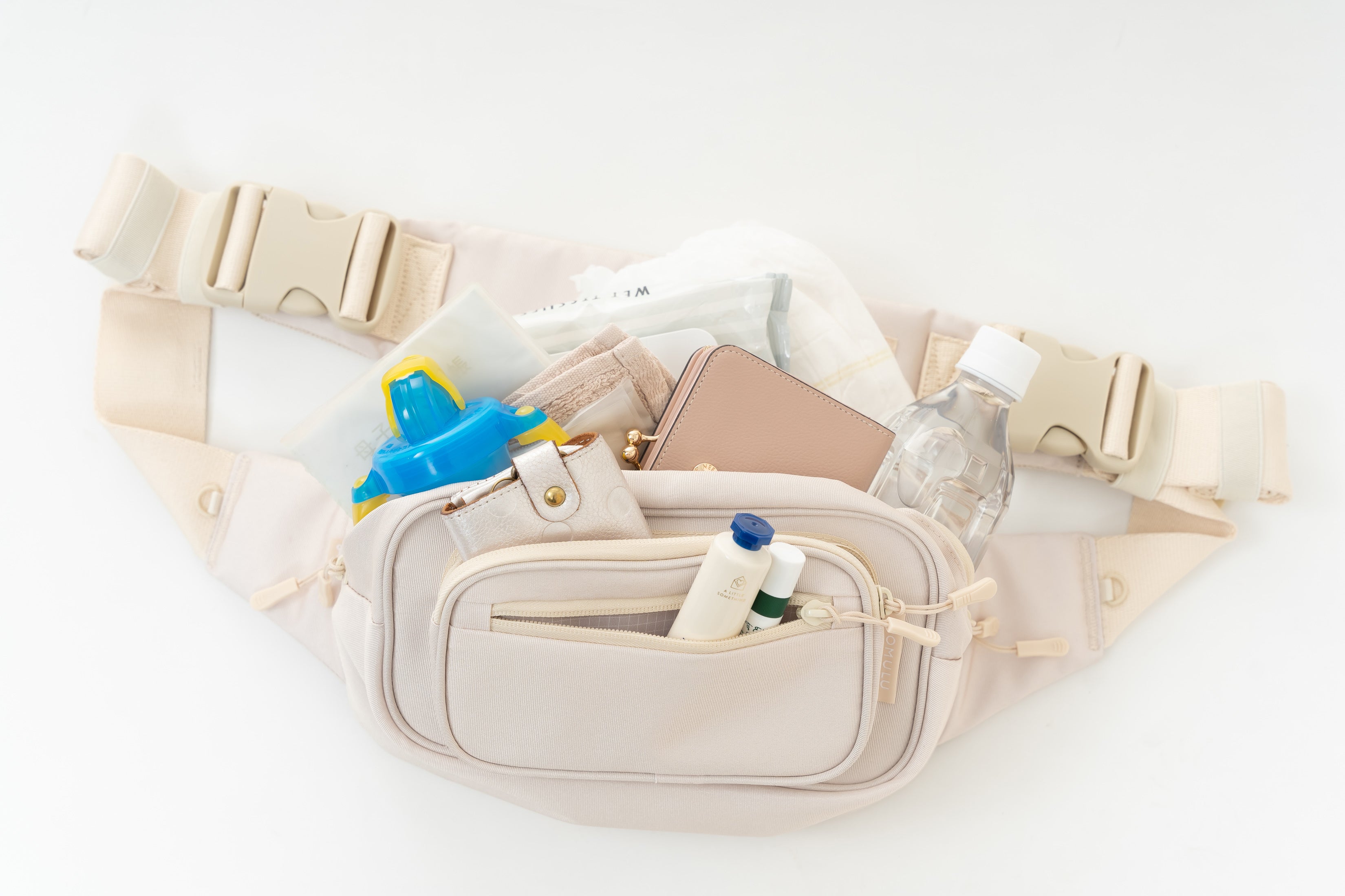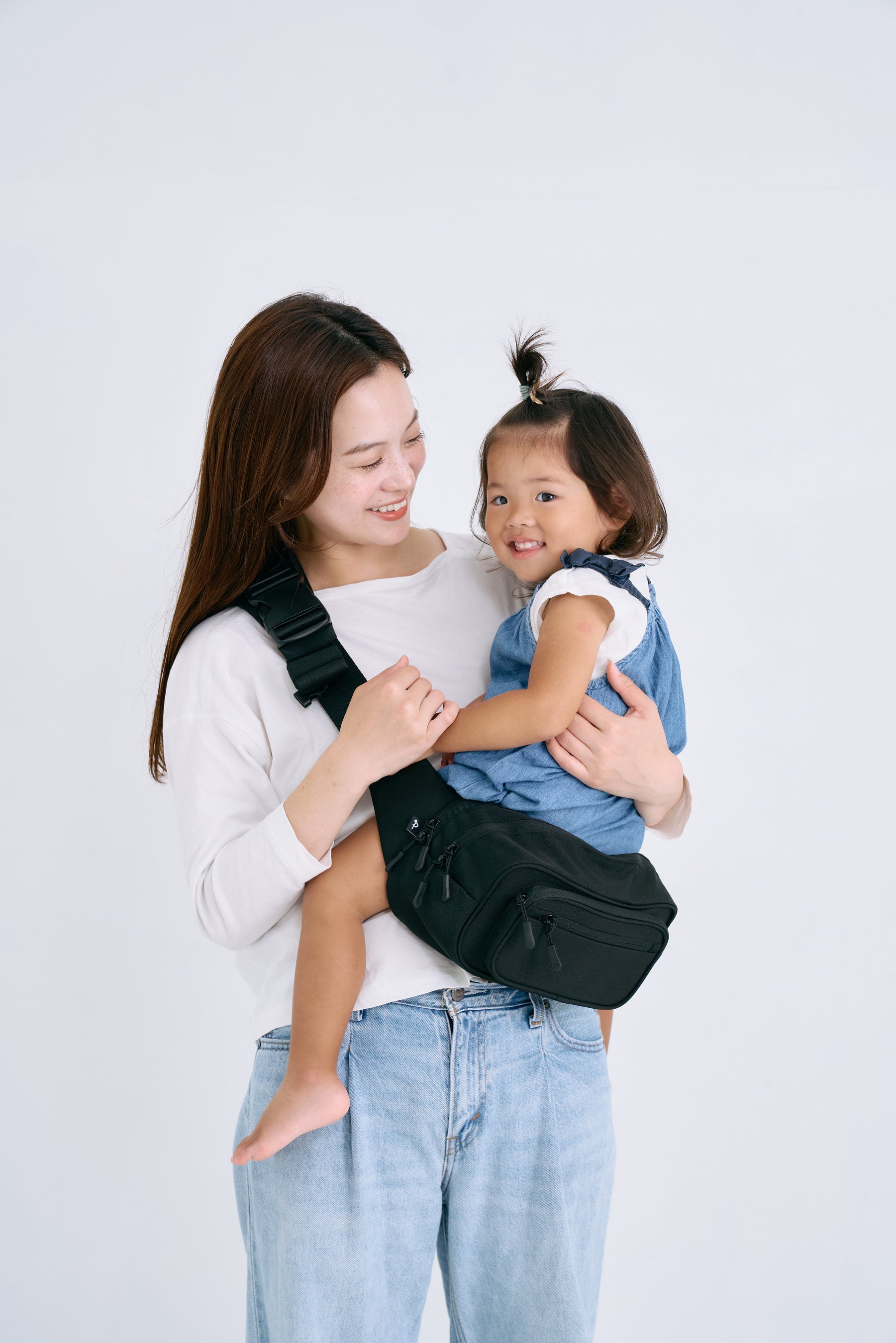 いつものショルダーバッグがヒップシートに早変わり。滑り止め付きの座面や腰サポートクロスで、お子さまを乗せた時の安定感も抜群です。抱っこをしていない時は通常のバッグとして活用でき、外出必需品がすっきり収まります。
