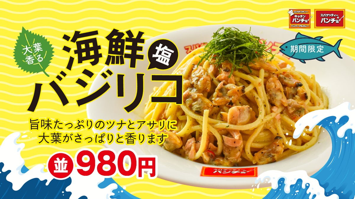 【パンチョがまさかのイタリアン?】期間限定メニュー「大葉香る 海鮮塩バジリコ」を10/16(月)に発売。バジリコオイル系スパゲッティーに旨味ツナ&たっぷりアサリ、トッピングは大葉でさっぱり感もプラス!