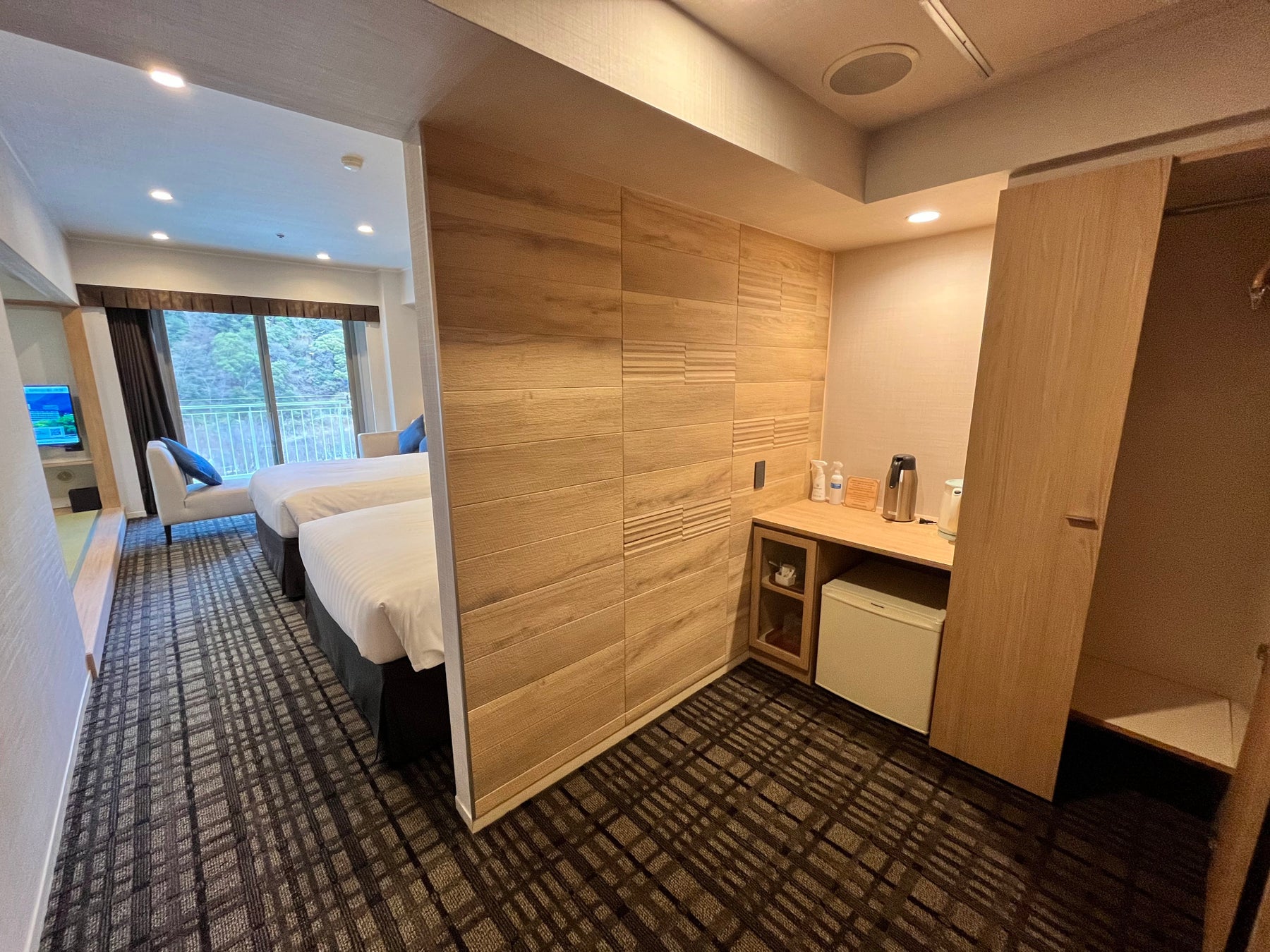 コンセプトは「癒しを紡ぐ部屋」。48㎡の広々とした空間は、箱根の自然と調和するカラーを基調とし、シンプルで落ち着いたデザインに一新され、和室、洋室それぞれの大きな窓からは、四季折々の箱根の景色をお楽しみいただけます。機能面では、それぞれ独立した洗面台、トイレ、バスルームの新装、個別空調への変更、サッシ交換による断熱、遮音性の向上、ベッドは上質な寝心地で定評のある「Serta(サータ」のセミダブルサイズを採用するなど、居住性への充実を図りました。最大6名までご滞在が可能、利用シーンや人数に応じてフレキシブルにご利用いただけますので、ご夫婦やカップル、ご家族や友人グループでのご旅行におすすめです。また、和室の雰囲気とベッドの快適性を兼ね備えた和洋室は、海外のお客様からも人気が高い部屋タイプです。